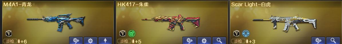 106V/六烈蝴蝶斯泰尔/炽芒蝶刃/传说光耀/传说破晓/M4A1-青龙/ScarLight-白虎/加特林-机械猎手/王者幻神/