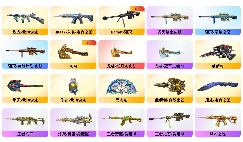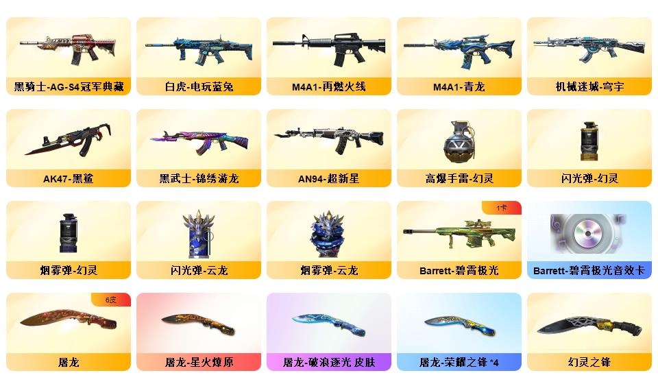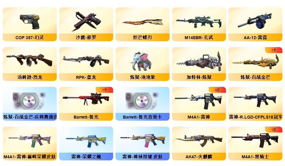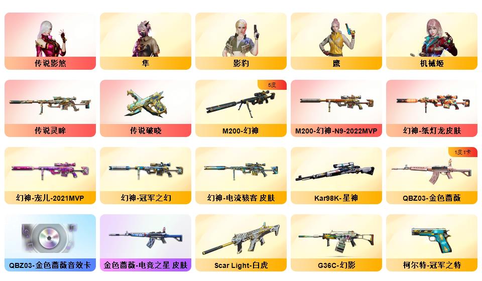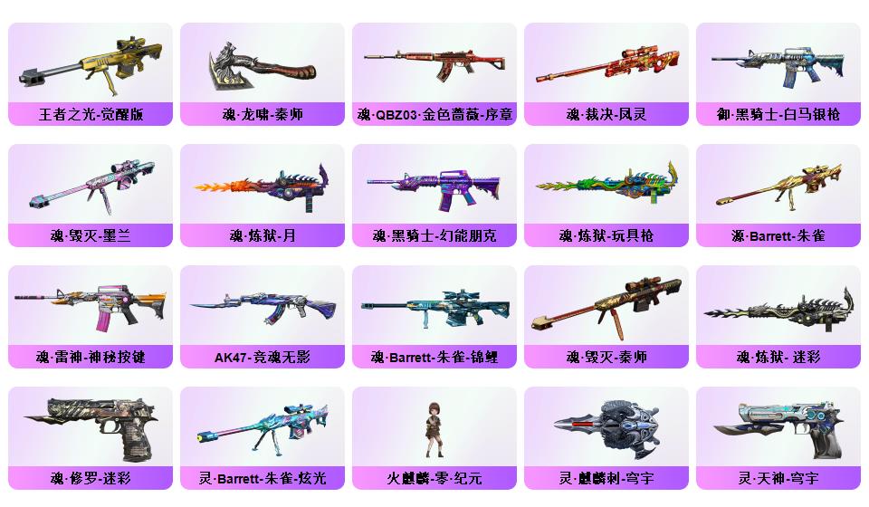 传说灵眸/传说破晓/幻神电流骇客 /幻神纸灯龙/幻神N9/幻神宠儿/幻神冠军之幻/毁灭英雄计划 /毁灭荣耀之怒/毁灭耀金/天龙CFSTAR/火麒麟CFSTAR/传说影煞 _影豹/鹰/隼/机械姬/战地猎狐/M200-幻神/Barrett-毁灭/Barrett-极光(3)/王者之怒-觉醒版/王者之光-觉醒版/QBZ03-金色蔷薇音效卡/AWM-昌龙-怀旧音效卡/Barrett-极光音效卡/Barret