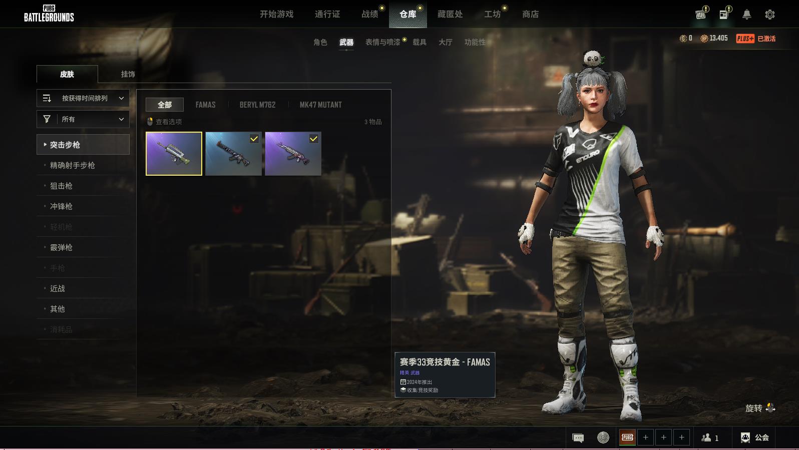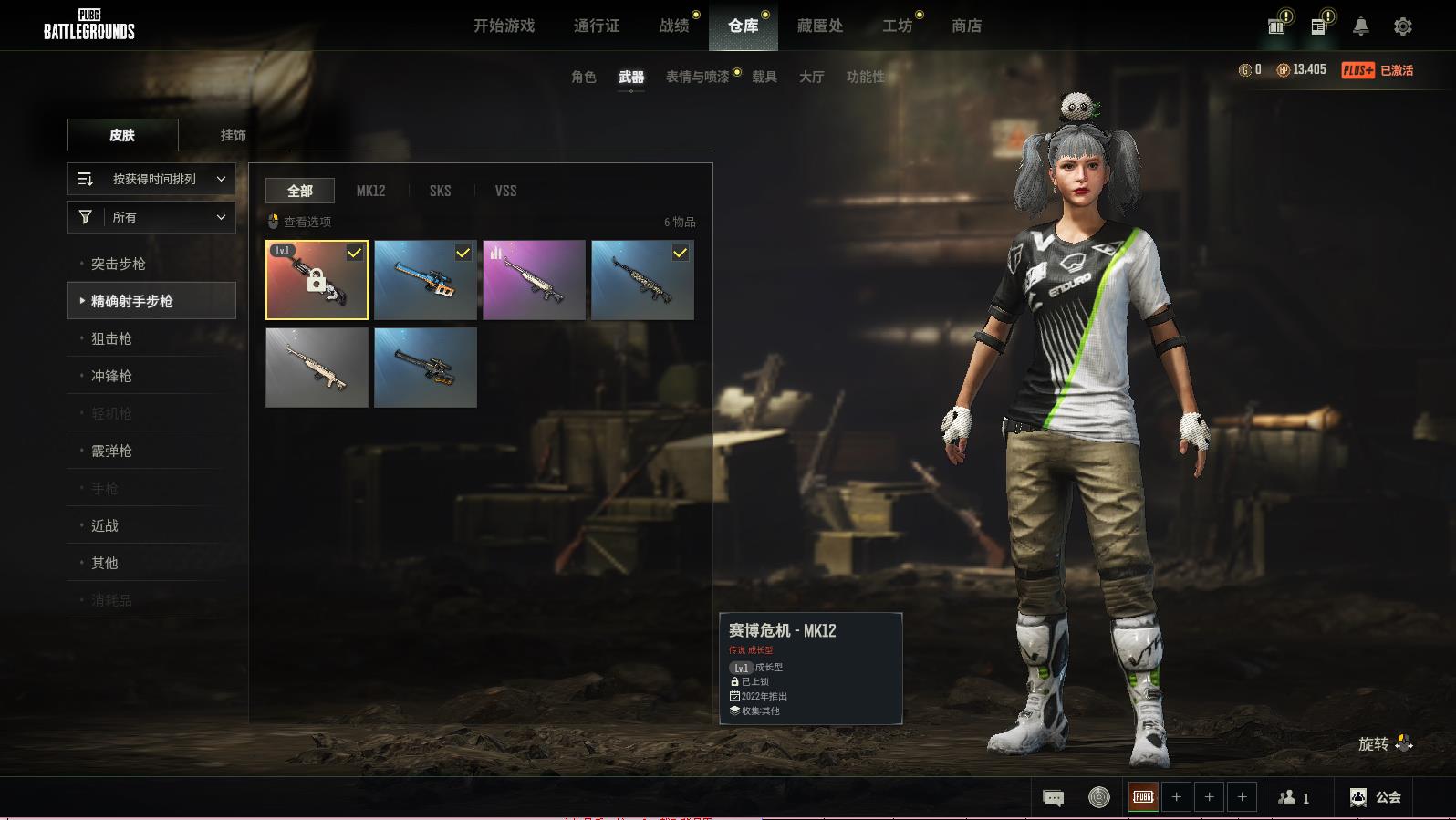 PUBG豪华版绝地求生可排位,赛博危机-MK12;十字军-SKS;寒季33章技黄金-FAMAS;一起摇滚-REPYLM762;悠扬情歌-KAR9RK;寒季32音