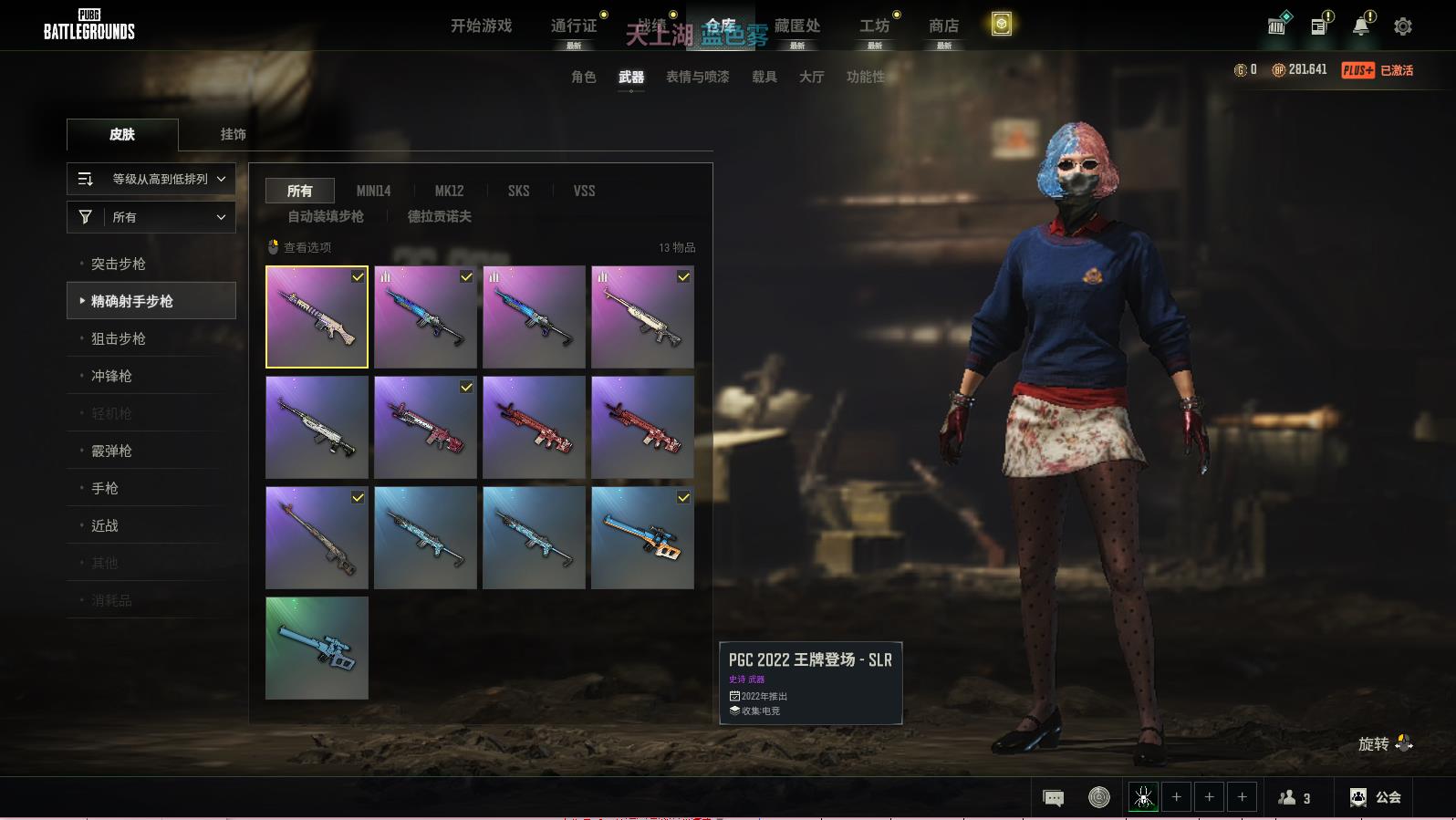 PUBG豪华版绝地求生可排位,无信号-M416;夺目寒光-BERYLM762战场痕迹;破碎元素-MINI14战场痕迹;PGC.2022王牌登场-SLP;十字军-SKS战场痕迹;分形几何:0BZ;银河卫士-SCAR-L;银河卫士:M16M;金色神焰-AKM;蔚蓝魔法爆裂考-G36C;魔力宝贝-M16M4;分形几何:SKS;银河小队-MK12;幽灵之握-MK12;致命快递:德拉贡诺去;幸运骑士-M24