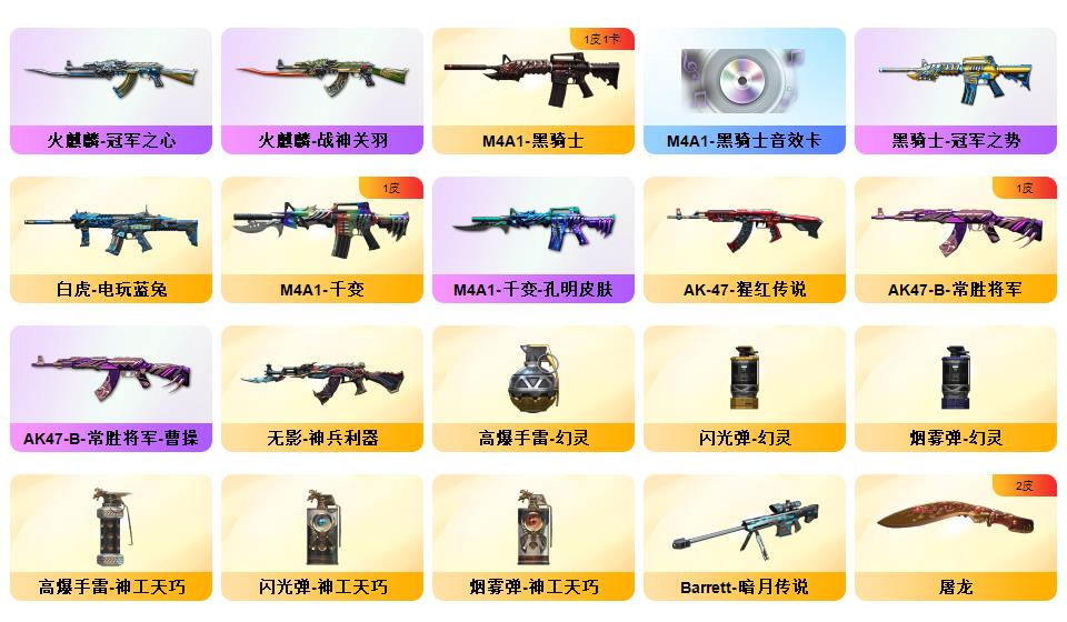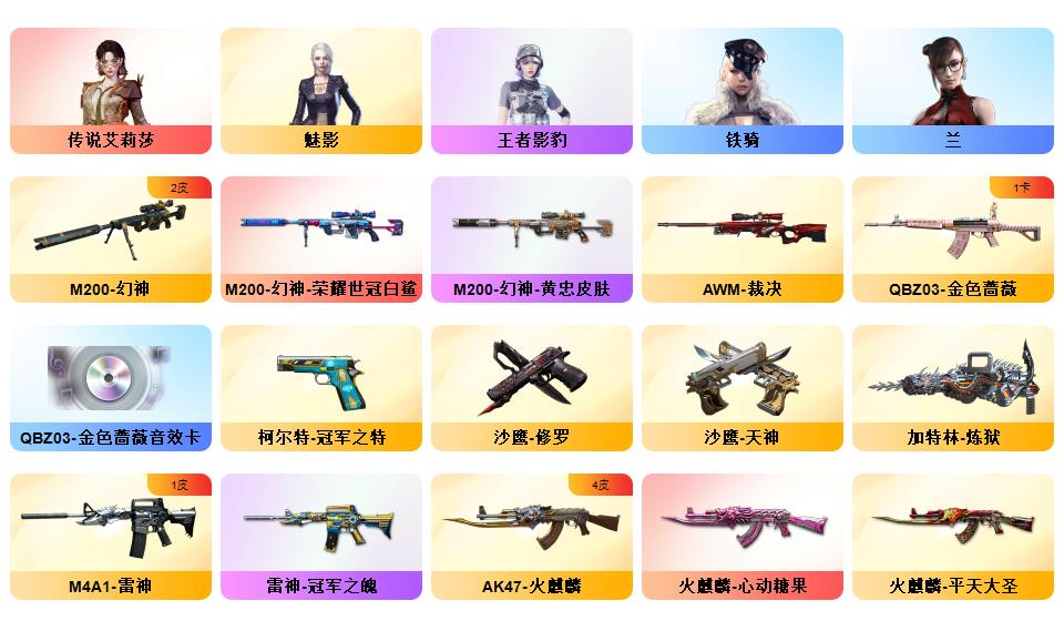 【传说艾莉莎】【幻神+幻神荣耀世冠白鲨+幻神动感闪耀+幻神黄忠】【冠军之特】【冠军之刃】【魅影+乔伊教练满套装+王者影豹+卡塔琳娜+职业选手/绝迹语音包】【白虎电玩+白虎之魄】【qbz金色蔷薇+qbz冠军之薇+金色蔷薇音效卡】【烈火动感闪耀皮肤+屠龙星火燎原+屠龙荣耀世冠ag+黑武士冠军之势+雷神战神赵云+火麒麟战神关羽+雷神动感闪耀+毁灭冠军之怒+火麒麟冠军之心+雷神冠军之魄】【毁灭音效卡+黑骑士音效卡+烈火动