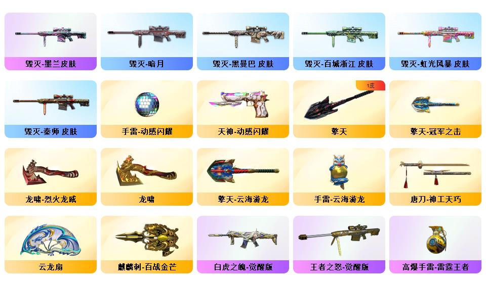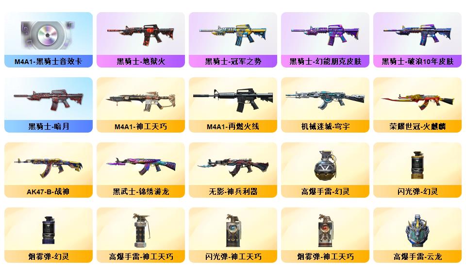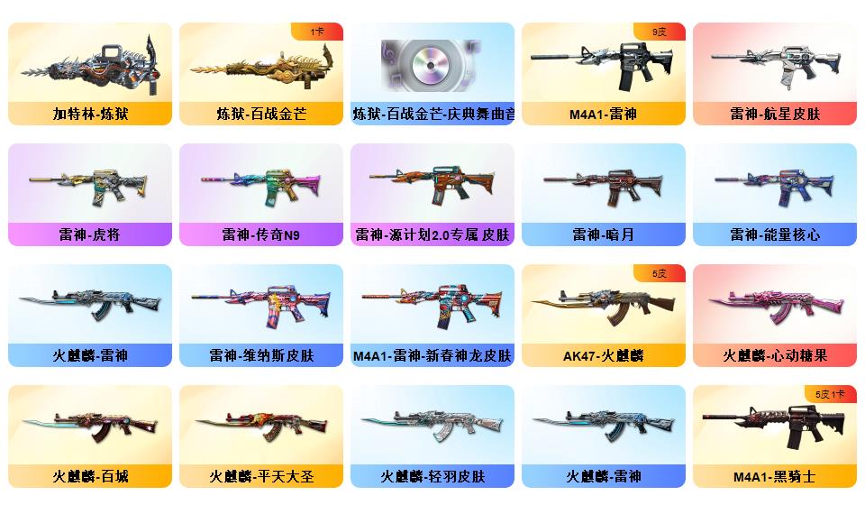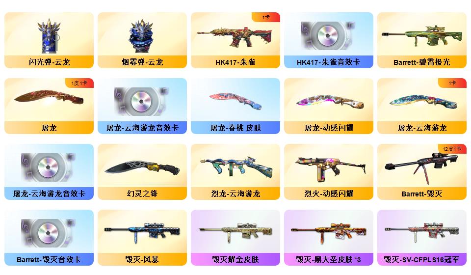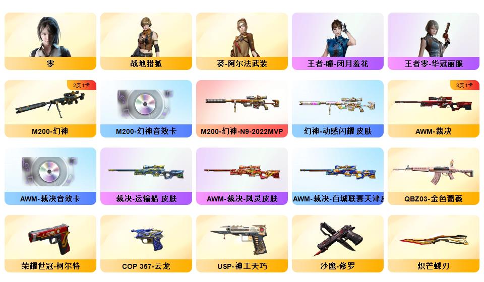 《m200幻神+n9-2022MVP皮肤+动感闪耀皮肤+幻神音效卡》《云龙套装+云海玲珑》《神工天巧套装》《炼狱百战金芒+音效卡》《白虎之魄》《炽芒蝶刃》《荣耀