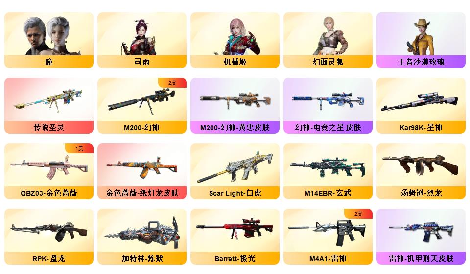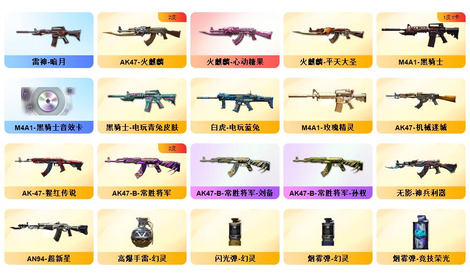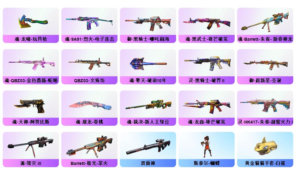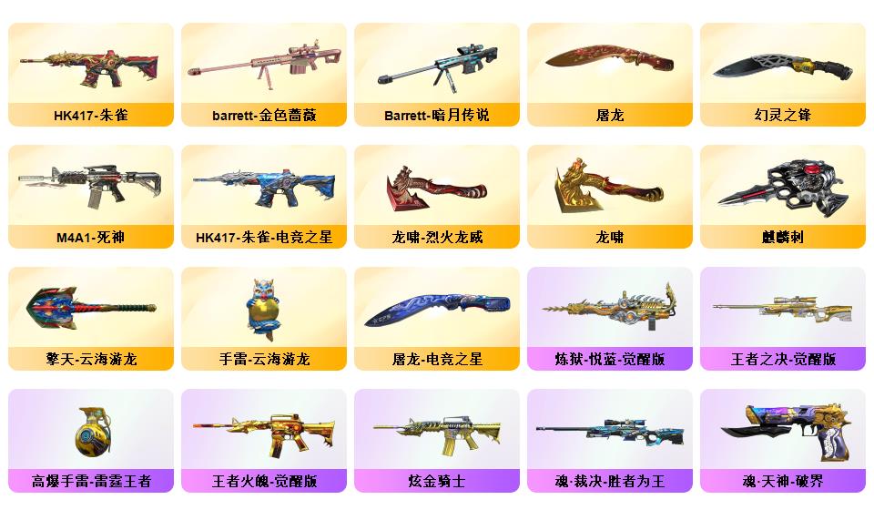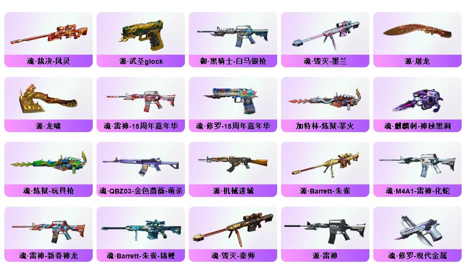 【穿越火线】福建一区 传说圣灵_M200-幻神/Barrett-极光/barrett-金色蔷薇/Barrett-暗月传说/Kar98K-星神/斯泰尔-幻面灵狐/斯泰尔-蝴蝶/王者之决-觉醒版/M4A1-雷神/M4A1-死神/M4A1-黑骑士(2)/M4A1-玫瑰精灵/HK417-朱雀/_Scar Light-白虎/白虎-电玩蓝兔/M14EBR-玄武/AK47-火麒麟(2)/无影-神兵利器/AK-47-猩红传说(2)/AK47-机械迷城/AK47-B-常胜将军/AN94-超