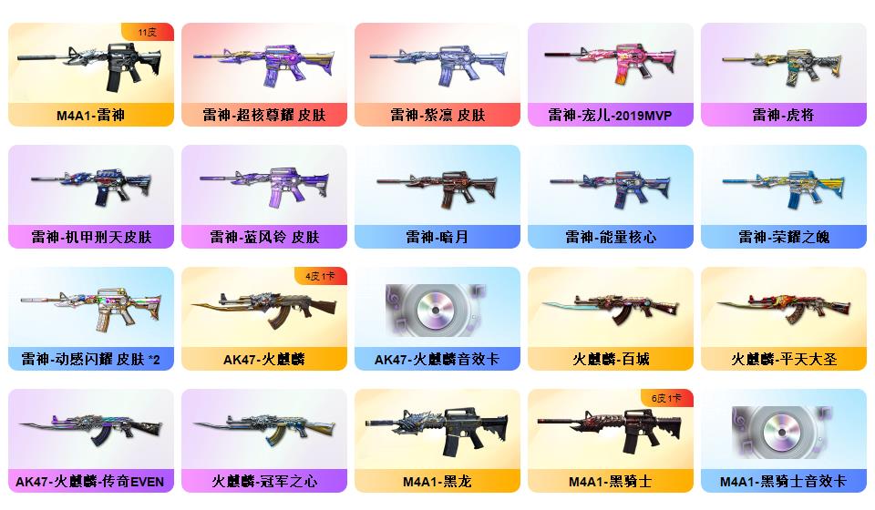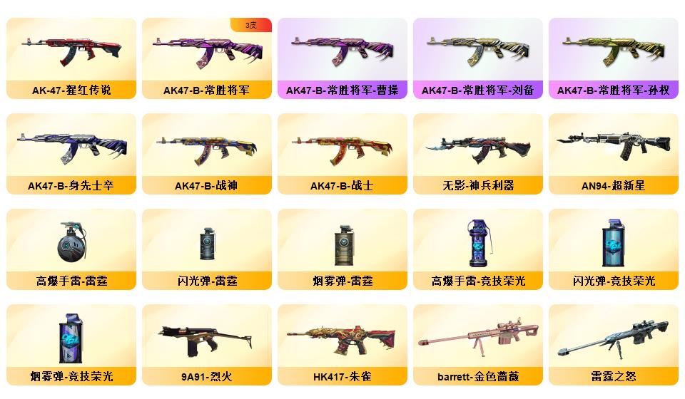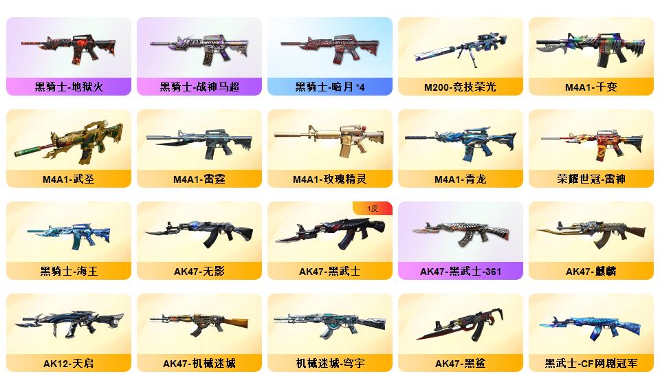 神威天绫,传说暗裔,传说浩劫,传说圣灵,4防传说艾莉莎 ,QBZ03-金色蔷薇*5,Scar Light-白虎,HK417-朱雀,M4A1-青龙,M200-幻神