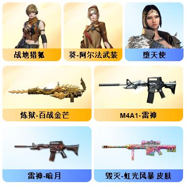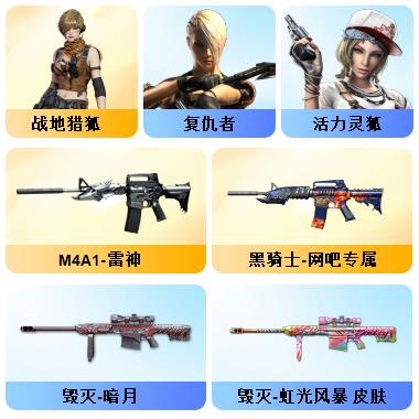 4防神威莲华+妮妮鹰迅捷虹喵+幻神3皮冠军音效三件套+裁决量子音效三件套+98K量子+金蚀+白虎巅峰音效三件套+QBZ冠军微+G36幻影+QBZ银翼+法玛斯天戎