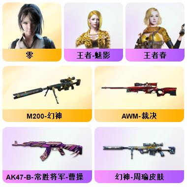 109V/六烈六盘/炽芒蝶刃/双面神/AWM-裁决/M200-幻神/幻神-曹操皮肤/ScarLight-白虎/电竞教官-云悠悠