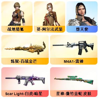 109V/六烈六盘/炽芒蝶刃/双面神/AWM-裁决/M200-幻神/幻神-曹操皮肤/ScarLight-白虎/电竞教官-云悠悠
