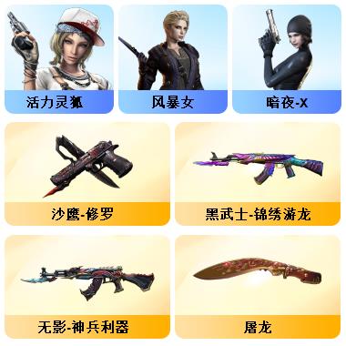 10王者☀毁灭音效卡☀7烈龙☀7副7刀☀CF网剧冠军套☀夜魔套☀堕天使套☀王者炎心☀死亡之眼子弹1000多发