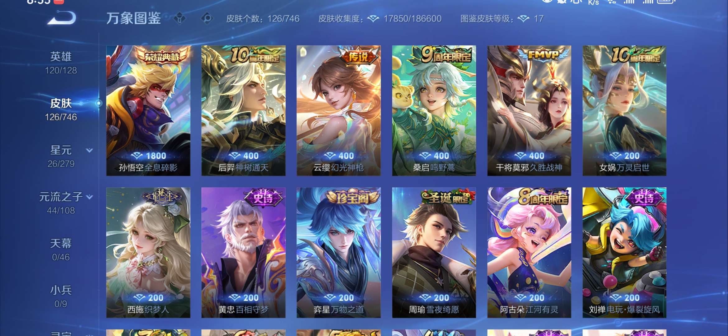 v10、509皮、刘备星传说时之思念、韩信荣耀典藏、瑶珍品传说大耳狗之梦、青丘·九尾、星域神启、画中仙、深海之息、天魔缭乱