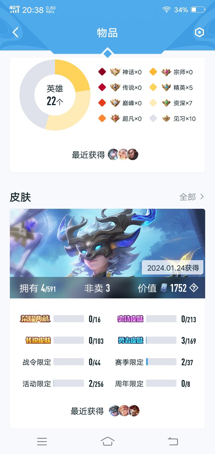 22个英雄7个皮肤,没有任何条件和限制已实名 以下信息为虚构 王者v8,微信区,115皮肤116个英雄,可满足一般用户需七个传说皮肤。47个勇者皮肤 26个史诗皮肤 57个 限定皮肤