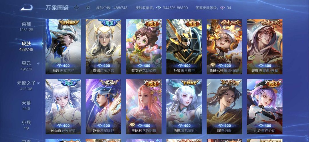 女生号 贵10 多皮肤多传说 别拿那些空号v10来比 要看性价比 貂蝉武则天夏侯惇孙悟空李白鲁班小乔荣耀水晶 妲己九尾无双皮肤 80个传说 473皮肤