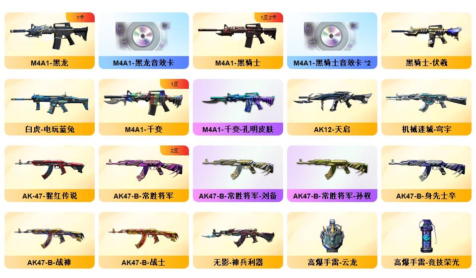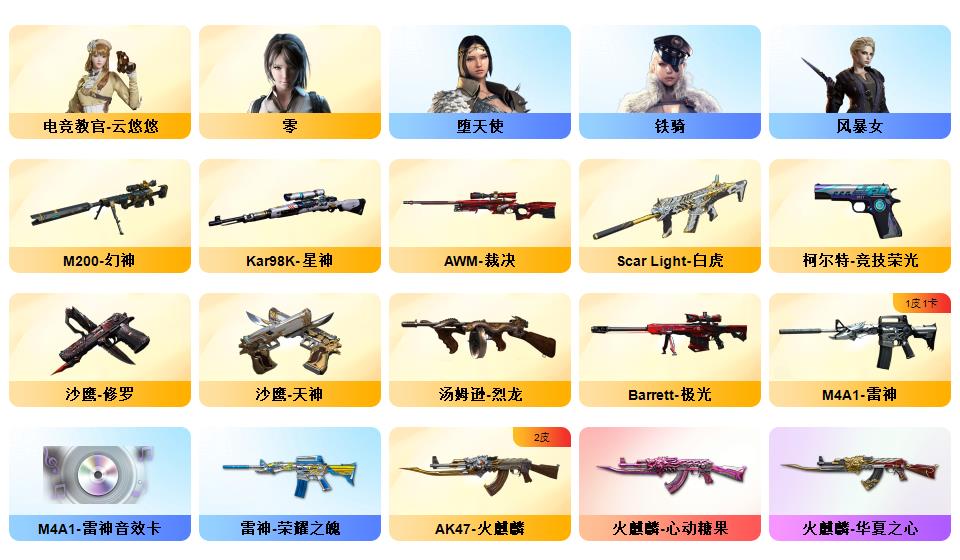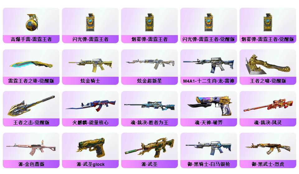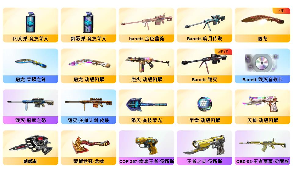 电竞教官,幻神,98k星神,2雷神荣耀之魄加音效卡,千变加孔明皮肤,2烈龙,黑骑士伏羲加音效卡,火麒麟(华夏之心),黑龙暗月,毁灭冠军之怒加音效卡,天启,Scar白虎,ak猩红传说加皮肤,ak-b3把,巴雷特暗月传说,2修罗,天神沙鹰,4屠龙加一荣耀之锋,麒麟刺,觉醒版王者之击,觉醒版王者之啸,角色零,3套王者雷霆手雷,觉醒版王者雷霆cop,王者雷霆尼泊尔,2awm裁决,巴雷特金色蔷薇,炫金骑士,巴雷特激光,荣耀世冠龙啸,竞技柯尔特,竞技擎天,竞技雷,王者之灵,烈火屠龙动感。