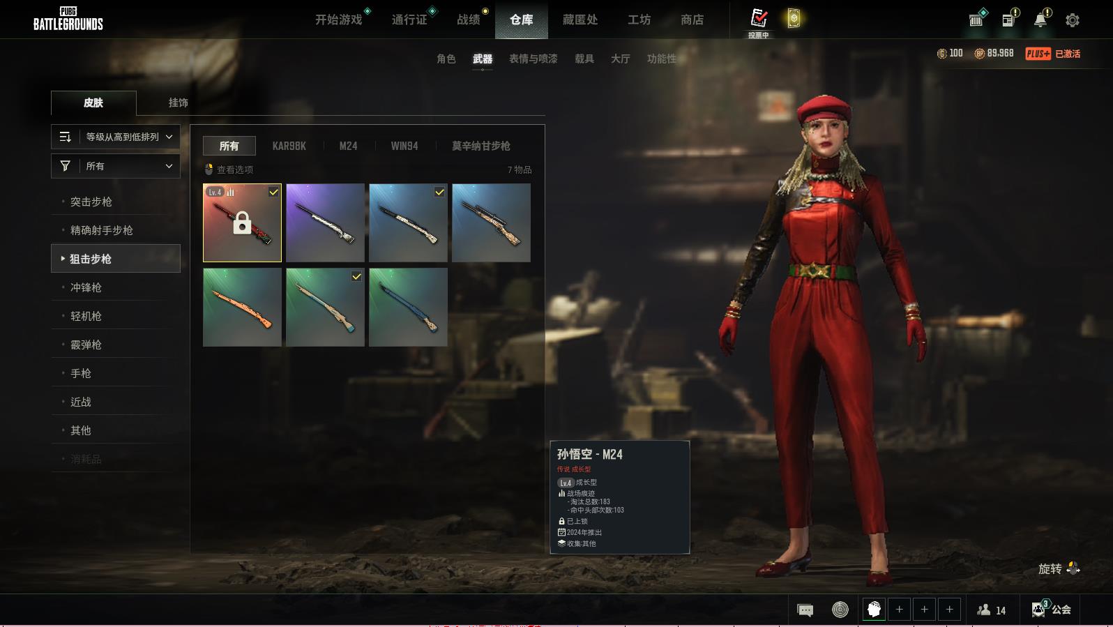 PUBG豪华版满级生存可排位,孙悟空-M24Lv.4183;蜂刺-BERYLM762;猪八戒-MKJ2;破碎元素-MINI14;蜂刺-SLR;十字军-SKS;无
