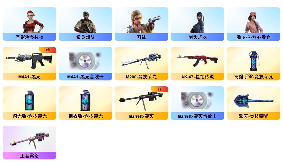 幻神荣光号/竞技荣光M200/新王者雷怒/毁灭音效+黑龙音效+竞魂超新星音效/毁灭青帝/竞技荣光擎天×2/竞技荣光投掷×3套/炫金毁灭/裁决小人枪/可排位