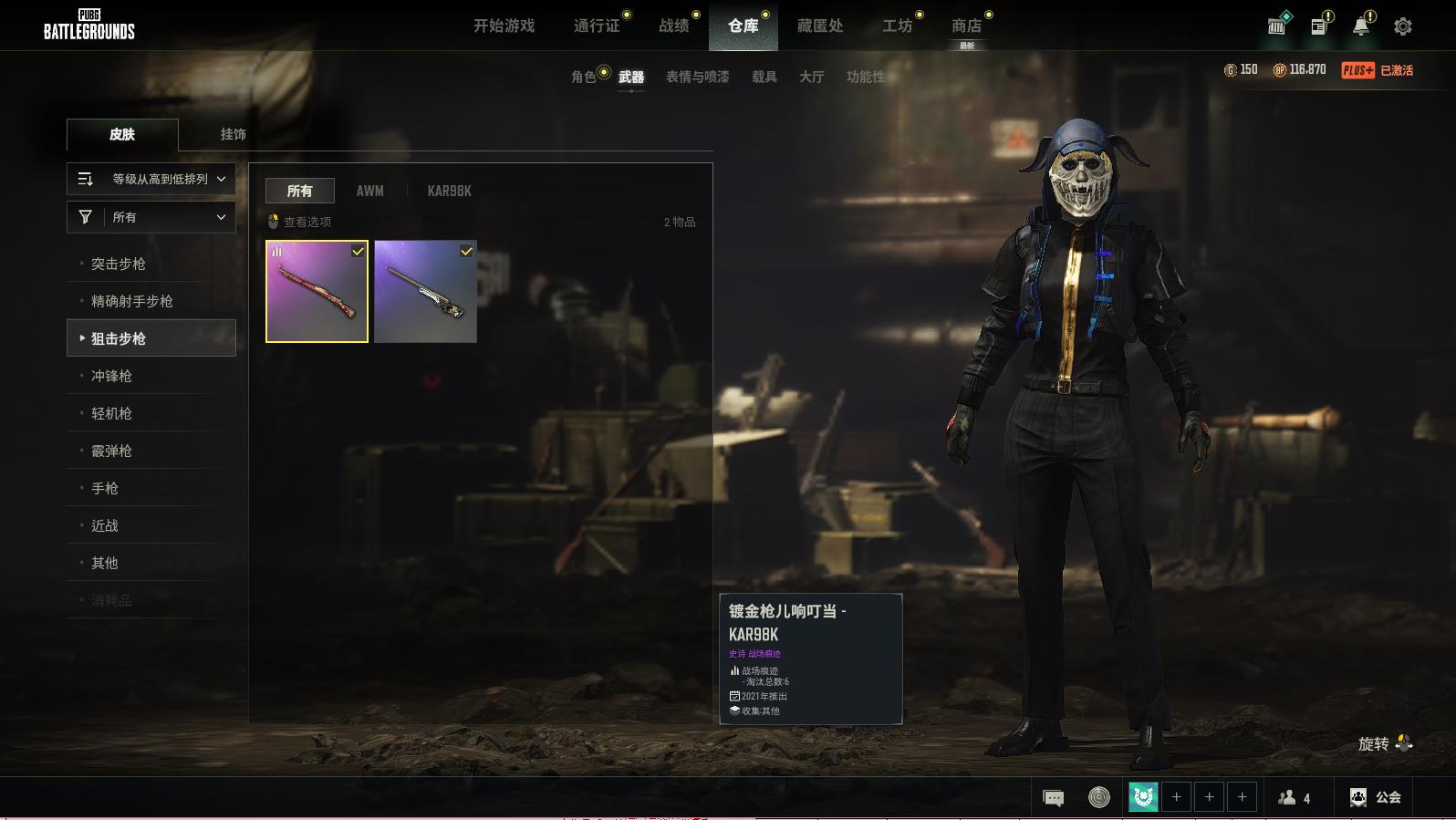 PUBG豪华版满级生存可排位,黑暗深渊-BERYLM762;爆裂弹球-AUGLv279;周六搅局者-MK12;镀金枪儿响叮当-KAR98K;梅花同花-BEPYLM762;奥丁的先锋-AKM;银河卫士-M16M;赛季33章技黄金-FAMAS;斑点狗-VSS;金色落叶-SKS;彩虹之上-MINI4;彩虹之上-SLP;蟒蛇花园-OBU;魔力甜心萨莉的永恒挚友·德拉贡诺夫;赛季31章技黄金-MK14;赛季30章技黄金-AWM;无信号-MICROUZI冲锋枪;寒季32音技黄金-P90;