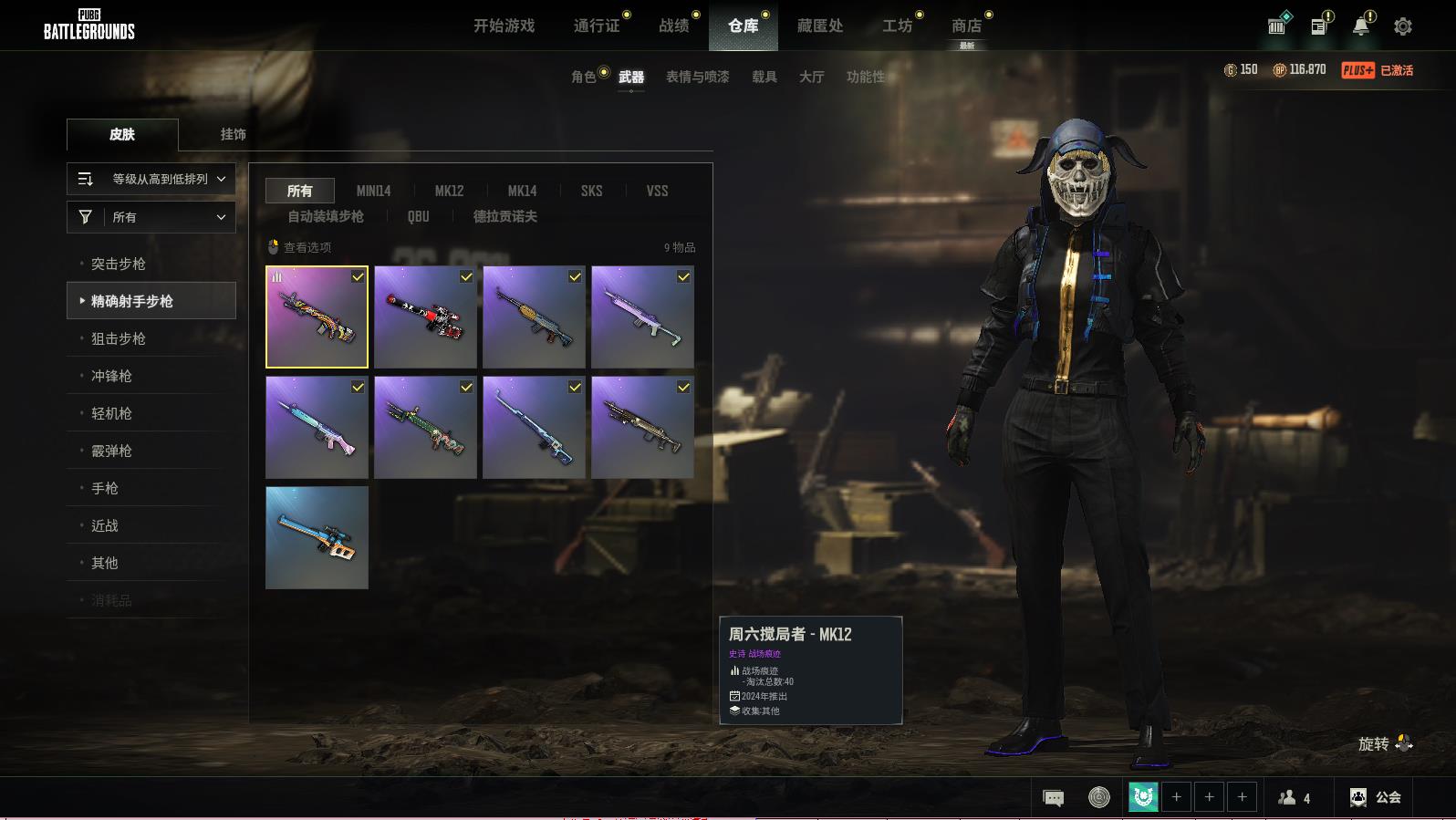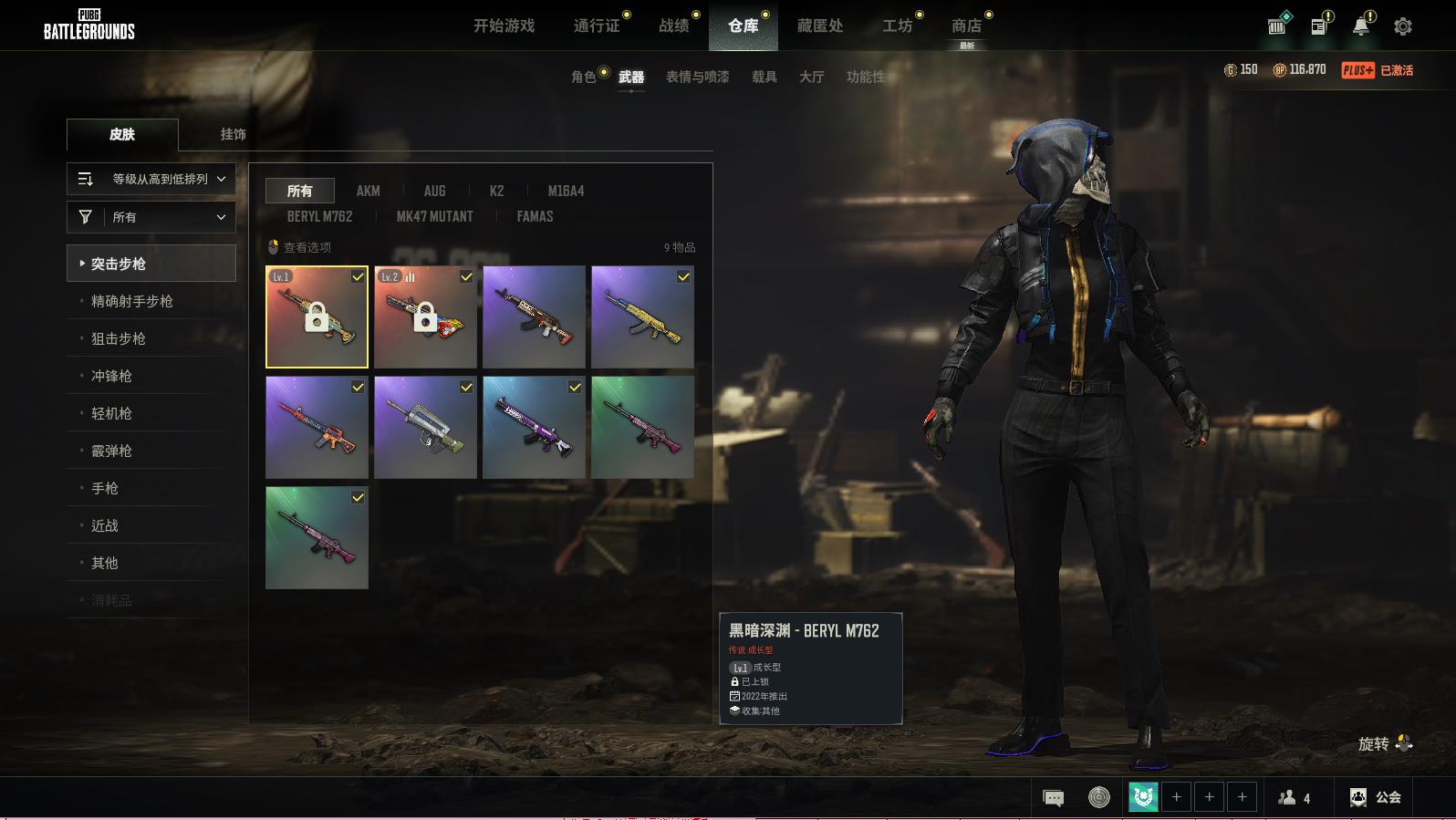 PUBG豪华版满级生存可排位,黑暗深渊-BERYLM762;爆裂弹球-AUGLv279;周六搅局者-MK12;镀金枪儿响叮当-KAR98K;梅花同花-BEPYL
