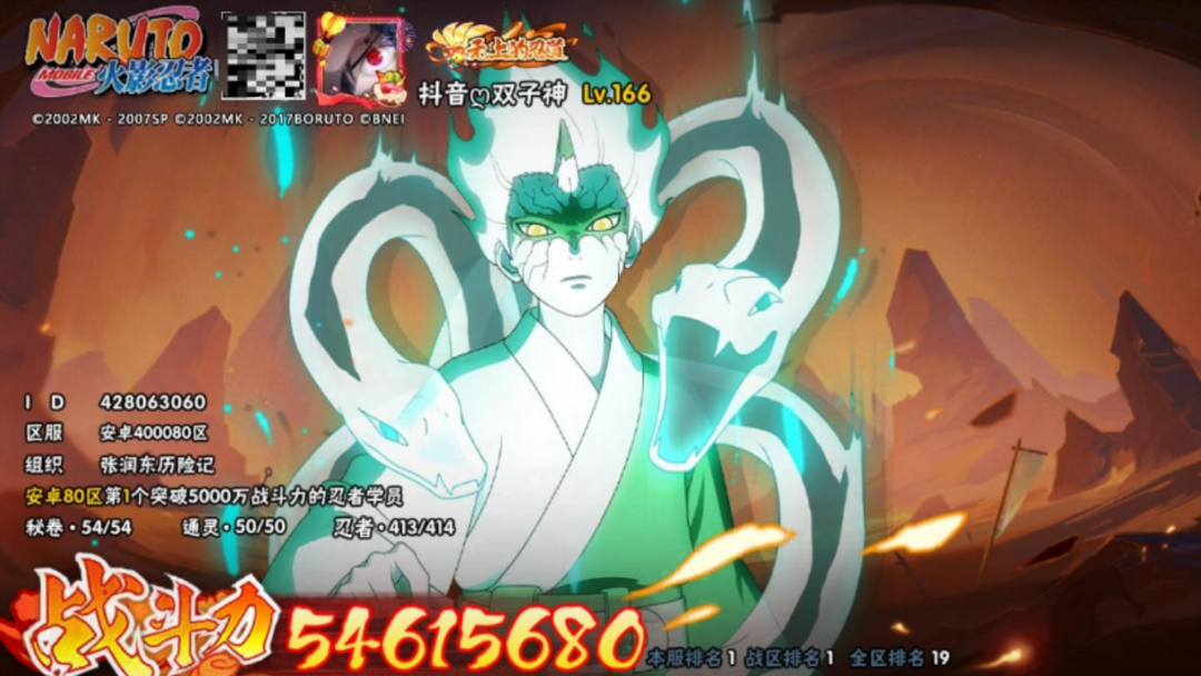 5400万战力✨仙人模式巳月✨五影会谈斑✨安Q全服榜19名✨无上的忍道✨团本秒杀✨全忍者全装扮全通灵