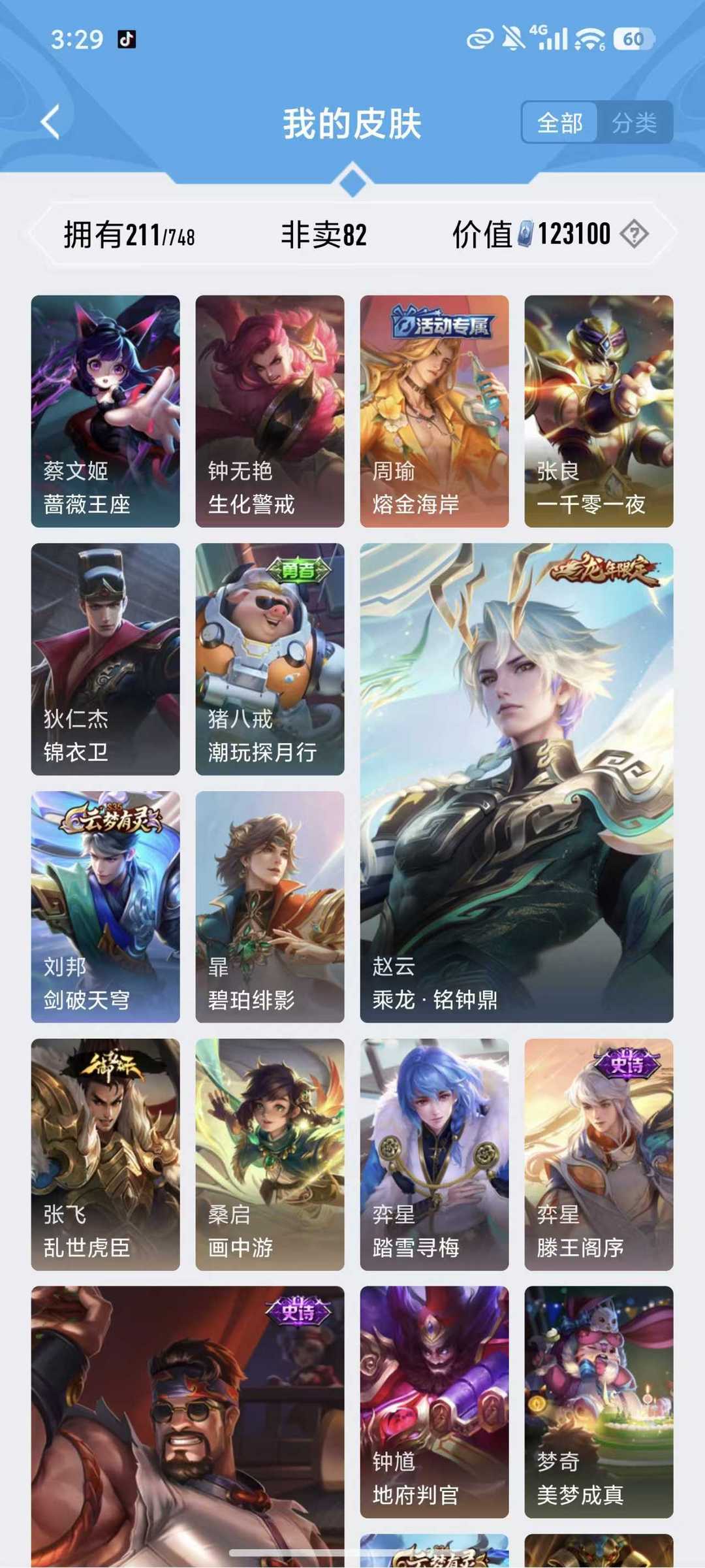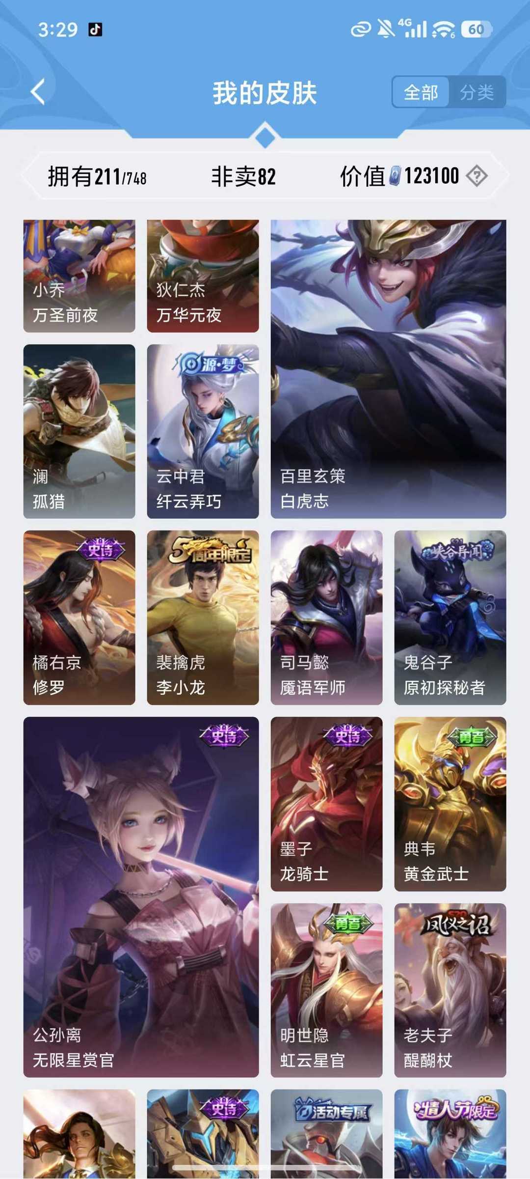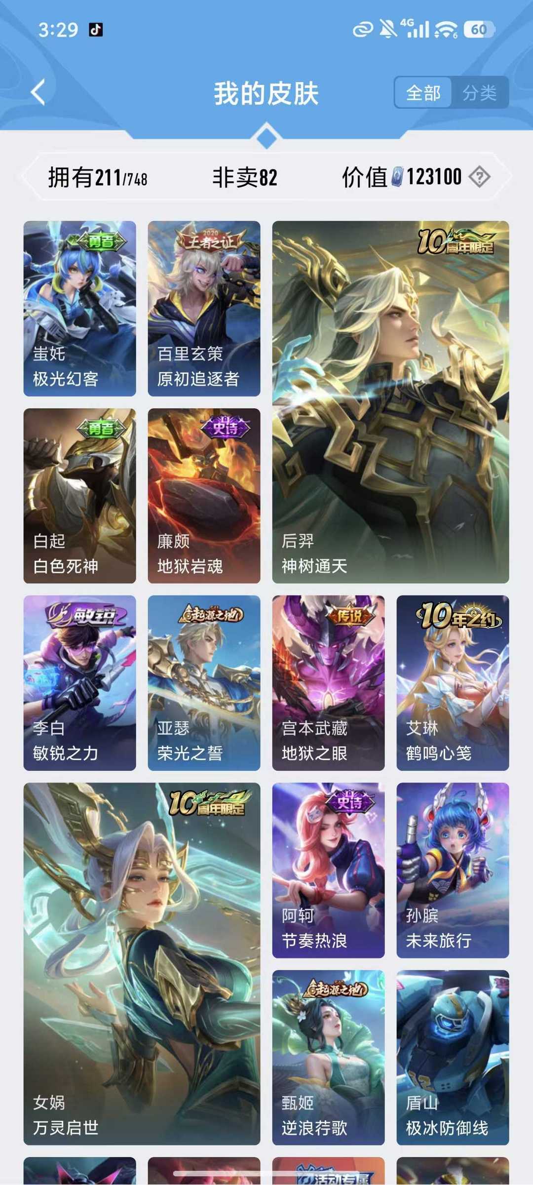 上不去看最后一张图游戏名字长租扫码上号无双贵族10,极品674皮,新皮肤基本全有,满珍品,7无双,10典藏,神威,炽阳神光,还有许多极品皮肤看图皮肤