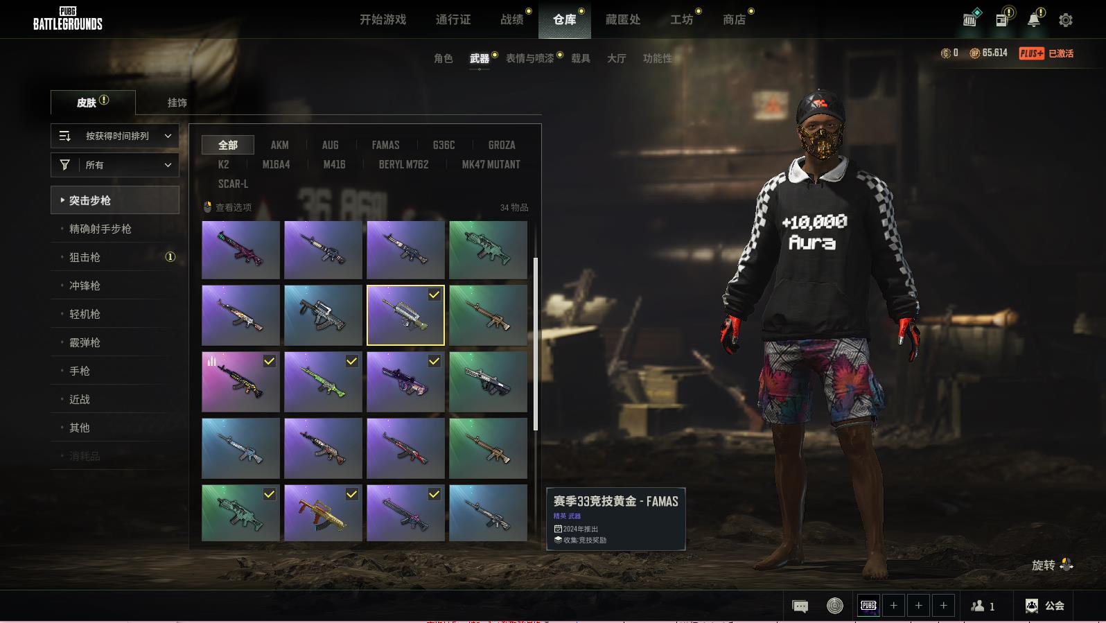 PUBG豪华版满级生存可排位,蜂刺-BERYLM762;青花之力-MINI14;漫彩四溢-SLR;周六搅局者-MK12;镀金枪儿响叮当-KAR98K;一击撕裂者-S1897;灵魂枷锁-MK47MUTANT;皇家舰队-M16A4;皇家舰队-K2;意速之道-AKM;寒季33章技黄金-FAMAS;天拘来世-K2;多彩科技猫-AUG;鎏金王朝-REPVLM762;焰弹召唤考-AKM;镀金-GROZA;心跳掠夺者-MK47MUTANT;银河卫士-M16M;蟒蛇花园-AKM;蟒蛇花园-M