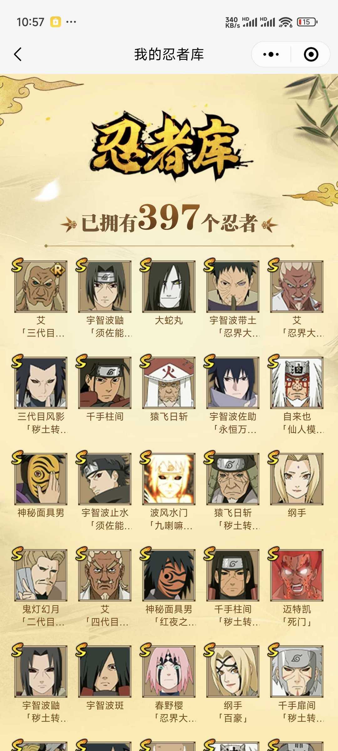 400全忍者♋55S♎3500W♊须佐卡卡西♍十尾带土♈九喇嘛水门♌大筒木舍人♒白面具♑忍战带土