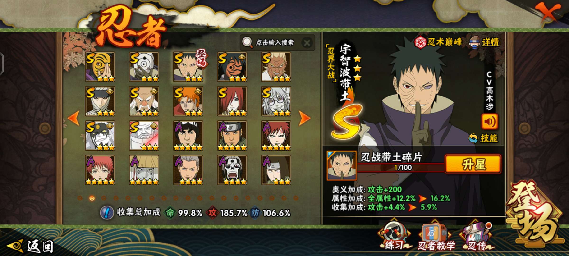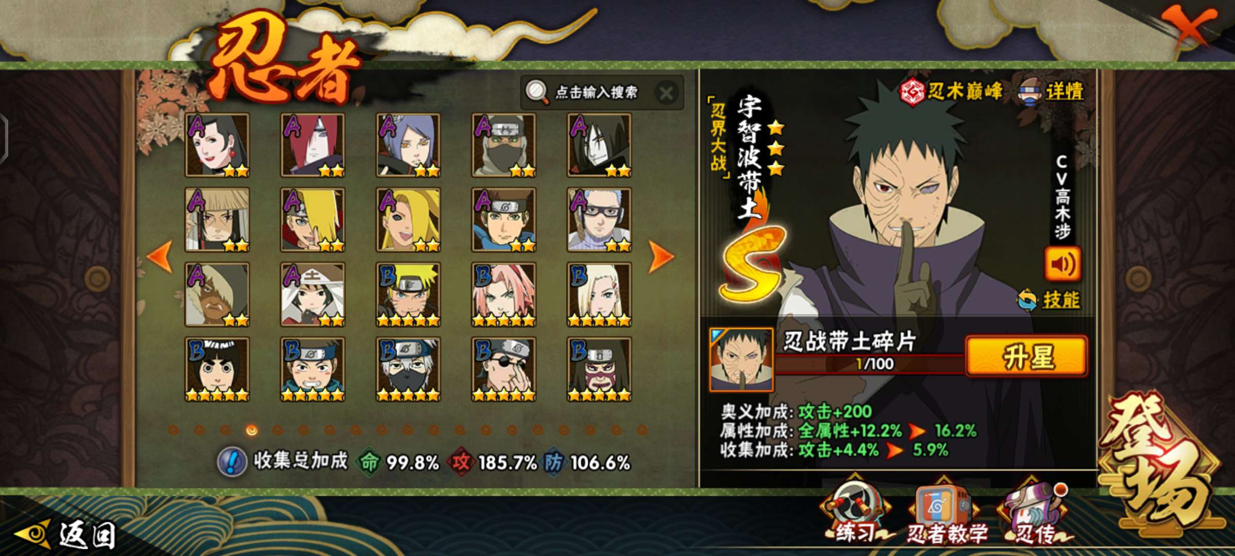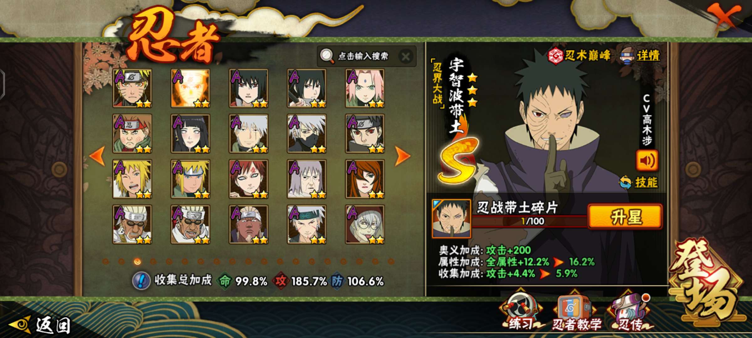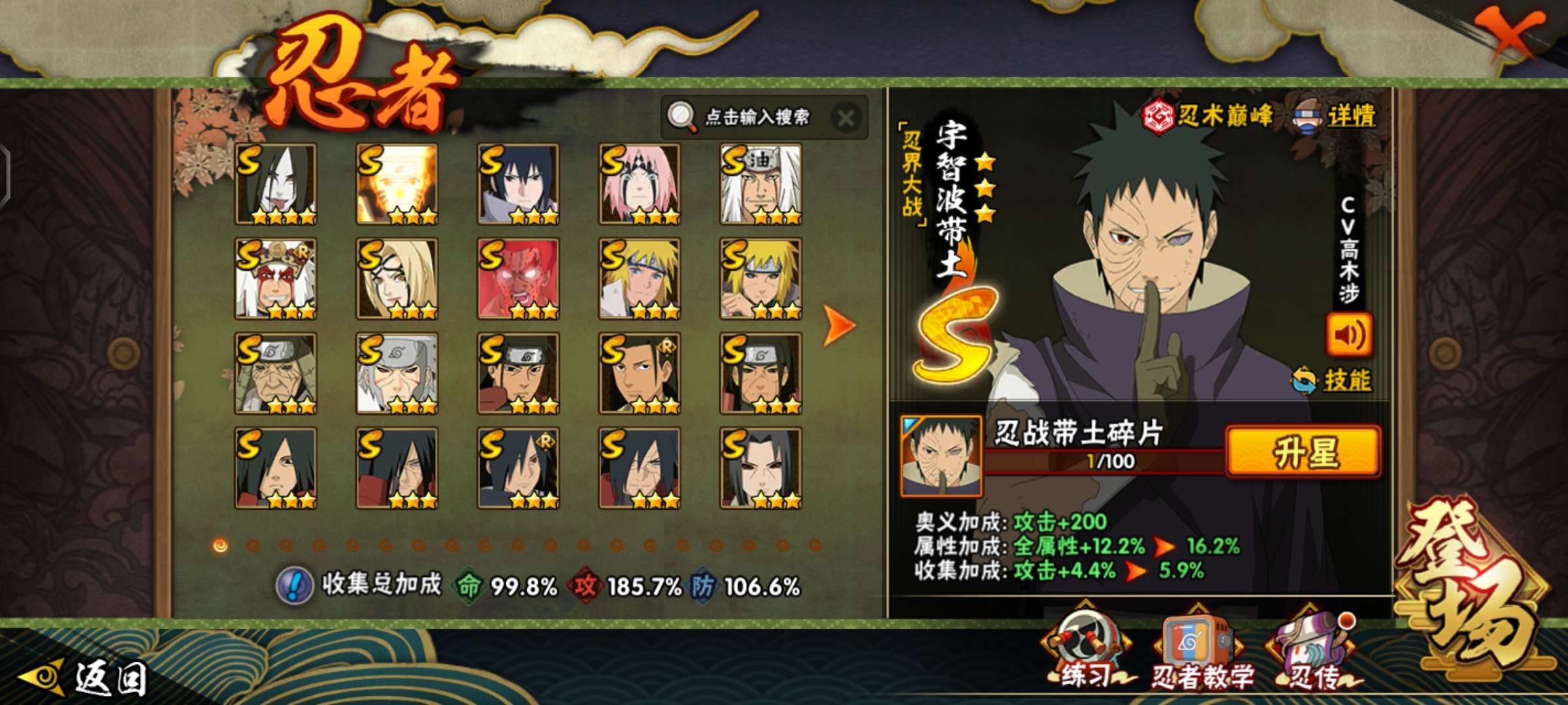 神威卡卡西,须佐止水,破面带土,白面具,红面具,热门忍者基本都有,通灵有熊猫,蓝猫