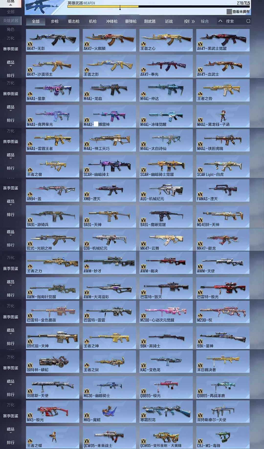 英雄武器368个, 王者武器24个。拥有:葵,子涵,云悠悠,等19个角色。特殊装备有:王者之影闪光弹、M12S雷霆、王者之击、MK23机械纪元、王者之势闪光弹、AA12雷神、AK47波塞冬、王者之烈、尼泊尔机械纪元、王者之势烟雾弹、王者之势手雷、A180地狱凤凰、王者之影手雷、王者之圣手雷、SCAR文远、M200幻神、嗜血金鲨、巴雷特变色龙、王者之神、MK23幻神、沙鹰波塞冬、MG36黑骑士、王者之翼闪光弹、王者之翼烟雾弹、巴雷特枪娘、G36竞技战魂、81式阿波罗、AUG机械纪元、TAC慈、沙鹰游骑兵、左轮竞界荣光、M4A1竞技战魂、MK47仁德、MK47机械纪元、墨刃幻神、RPK美杜莎、81式机械纪元、地狱烈炎、巴雷特安琪拉、G36机械纪元、QCW05变形金刚·大黄蜂、尼泊尔竞界荣光、王者之影烟雾弹、铁锹游骑兵、雷霆、SKS美杜莎、9A91游骑兵、AN94超新星、M12S雷霆王者、KAC变色龙、KSG孟获、王者之蝶、黑骑士烟雾弹、黑骑士闪光弹、98K星神、巴雷特雷神、VEPR12本初、黄金风之子、USP仁德、风之子、COP357A、云悠悠、关小雨、堕天使