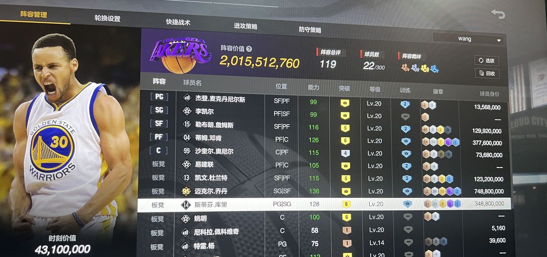 20亿阵容满大时刻95乔丹,6突小时刻库里,6突新邓肯,6突小时刻雷霆杜,5突骑士詹姆斯,x11波特