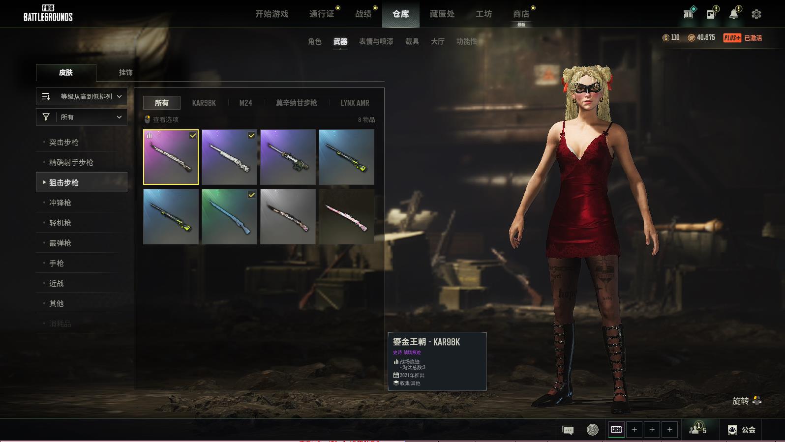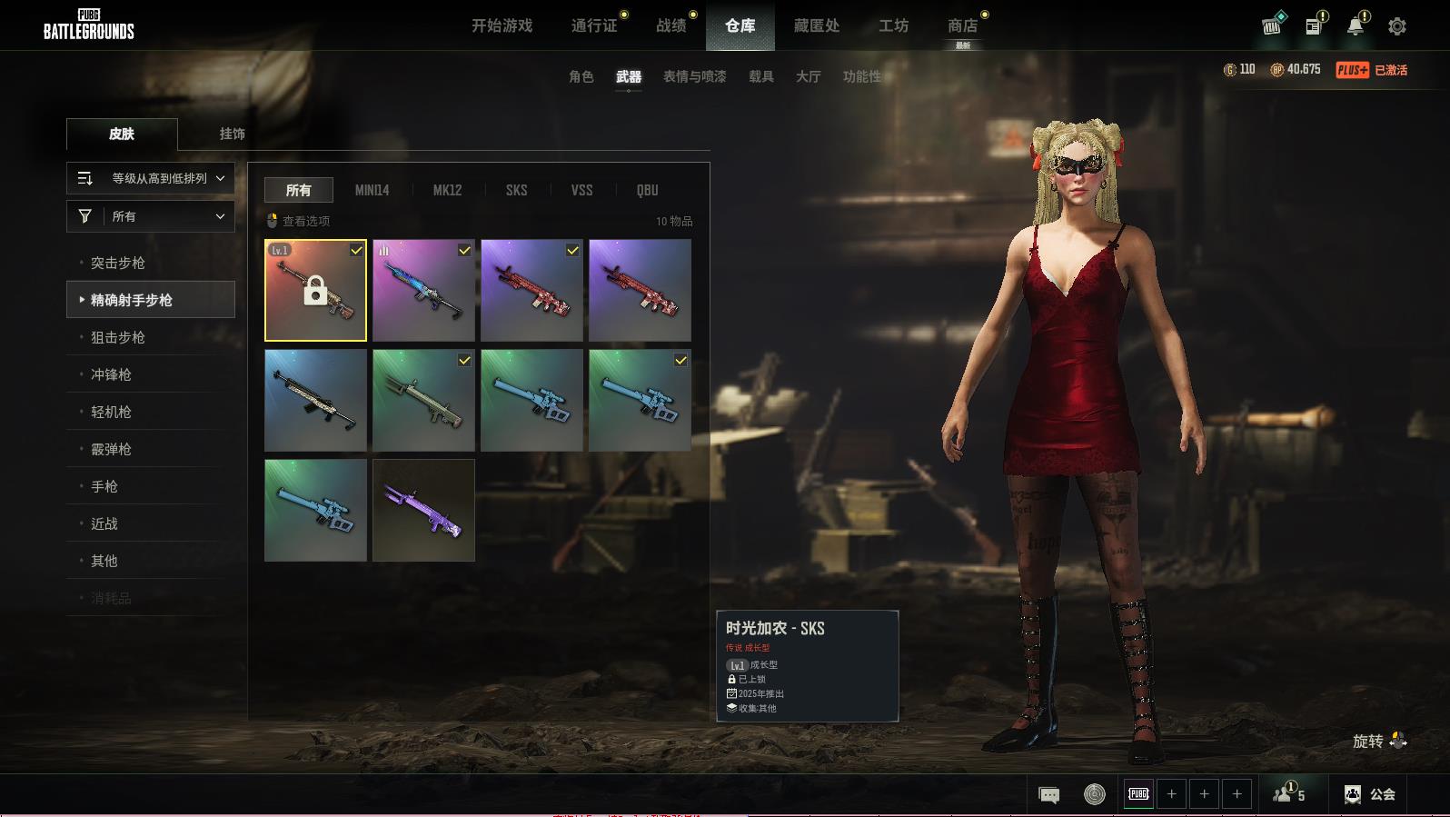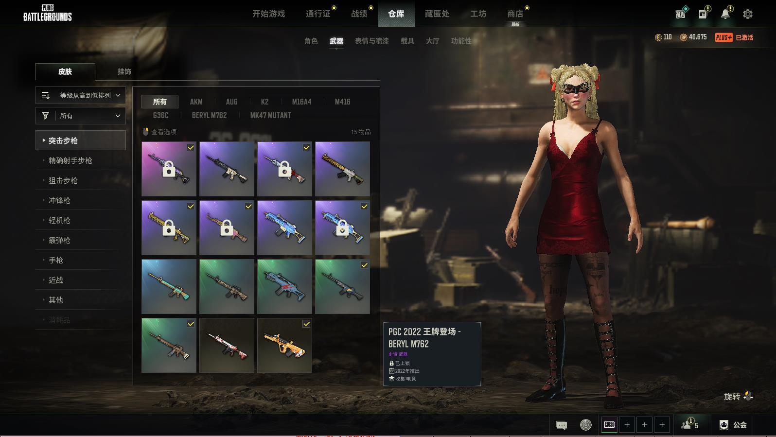 PUBG豪华版绝地求生可排位,时光加农-SKS;PGC2022王牌登场-BERYL M762;破碎元素-MINI14;鎏金王朝-KAR98K;数码沙漠迷彩-M4