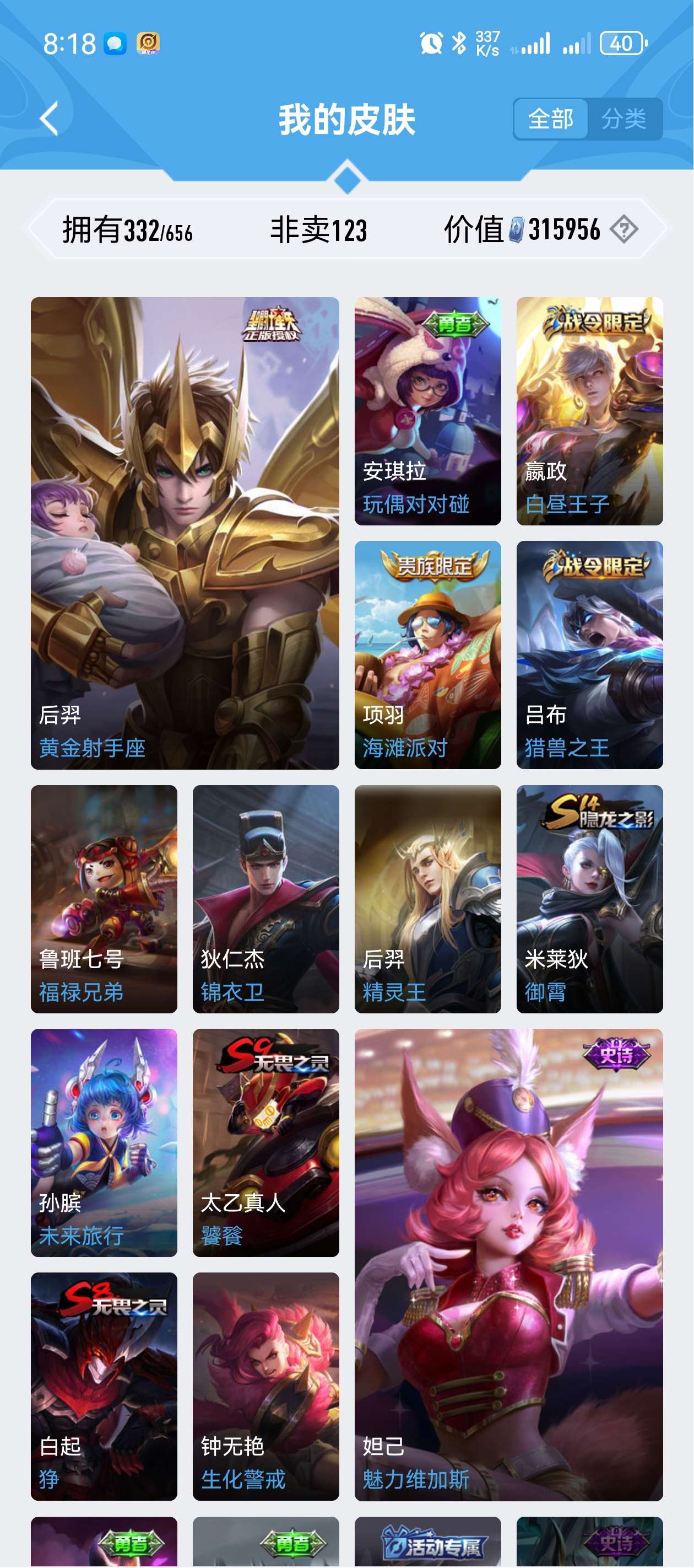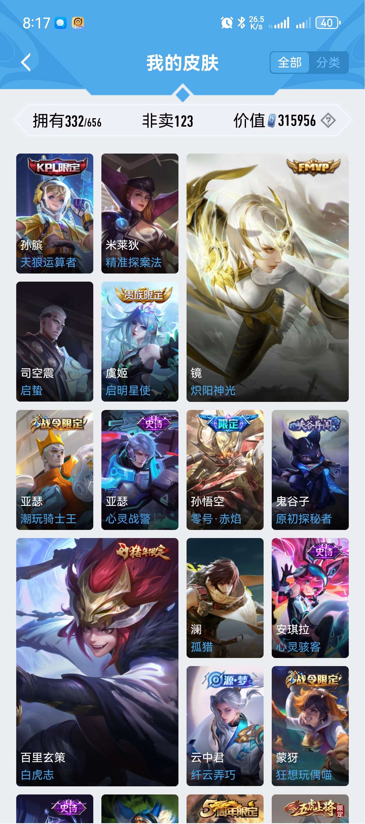 手Q安卓512区,荣耀典藏4个,传说32个,FMVP5个,各年限定,皮肤很多,基本一个英雄一个,部分英雄全皮肤,匹配排位等模式随便玩,不要恶意摆烂就行