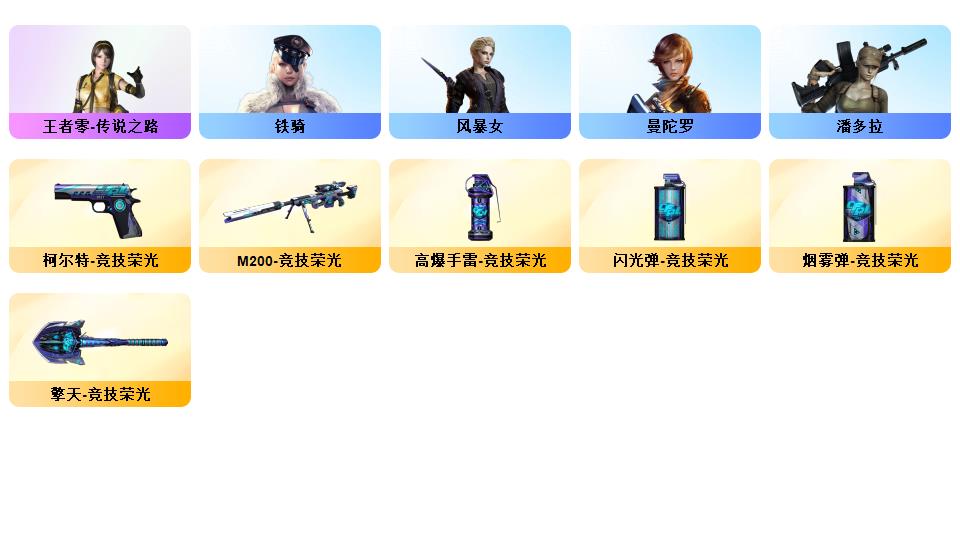 幻神荣光号/M200竞技荣光+柯尔特竞技荣光+擎天竞技荣光+竞技荣光投掷×2套/云海玲珑/乔伊教练/竞魂无影/赤狱骑士/只有一套竞技荣光,剩下的都是源武器。