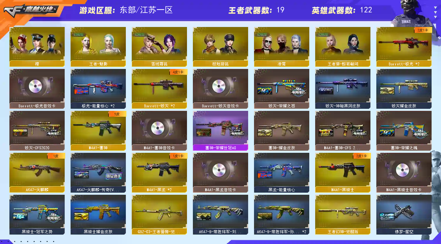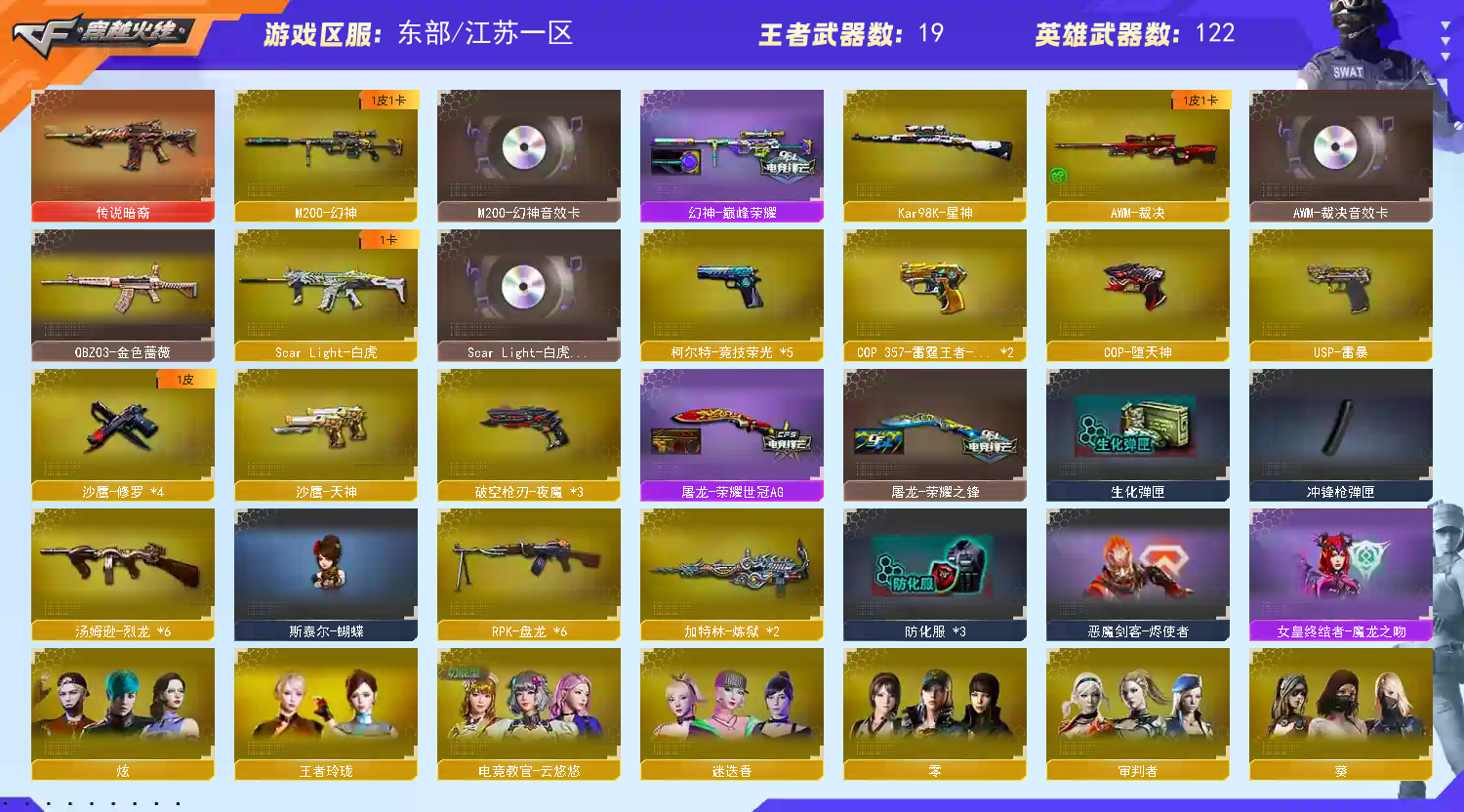 游戏之前需要安装【反作弊预启动模式】重启电脑,不安装会进游戏就闪退. 【重要武器】幻神 星神 HK417-朱雀 QBZ03-金色蔷薇 Scar Light-白虎 王者之魄-觉醒版 6烈 【重要皮肤】幻神-巅峰荣耀 AWM-天龙-传奇70KG AK47-B-常胜将军-刘备|孙权 战神-流金岁月皮肤 屠龙-荣耀世冠AG 屠龙-荣耀之锋 擎天-冠军之击 【副武器】COP-堕天神 COP 357-雷霆王者-觉醒版X2 天神-CF网剧冠军 沙鹰-修罗X2 破空枪刃-夜魔 柯尔特-竞技荣光X2 USP-雷暴 【重要角色】凌露 审判者 迷迭香 炫 樱 电竞教官-云悠悠 零 葵 王者葵-惊若翩鸿 王者玲珑 王者-魅影 雅典娜 幽 灵狐者-职业经理 铁骑荣耀 新灵狐 【重要音效卡】AWM-裁决音效卡 Barrett-极光音效卡 M200-幻神音效卡 M4A1-黑骑士音效卡 M4A1-黑龙音效卡 Scar Light-白虎音效卡 M4A1-雷神音效卡 Barrett-毁灭音效卡 【近身武器】麒麟刺X2 王者之啸-觉醒版 擎天 屠龙X5 幻灵之锋 王者之锋-觉醒版 斩神刀-雷暴 【温馨提示】此号价值数万,已向公安机关报备,如有开G开辅助封号的,由平台提供,身份信息证据和地址进行报警处理并依法追究.;USP-雷暴,电竞教官-云悠悠,RPK-盘龙,QBZ03-金色蔷薇,M200-幻神,Scar Light-白虎,Kar98K-星神,
