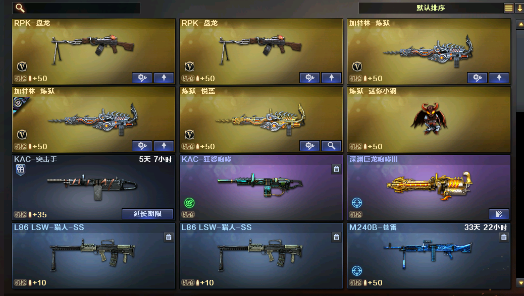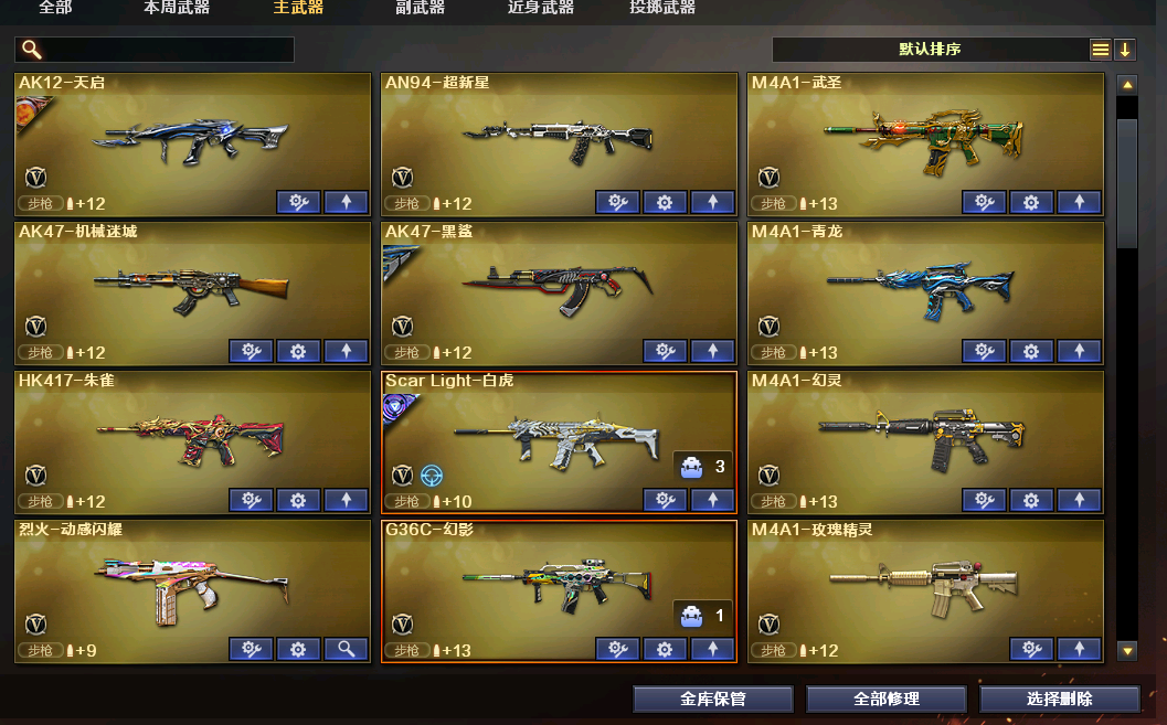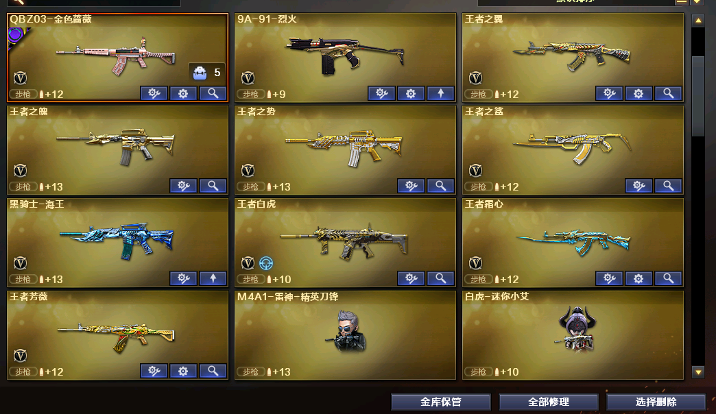 各种主流枪械都有皮肤,文明用号;柯尔特-冠军之特,炽芒蝶刃,Knife-冠军之刃,晴雅,传说艾莉莎,RPK-盘龙,QBZ03-金色蔷薇,