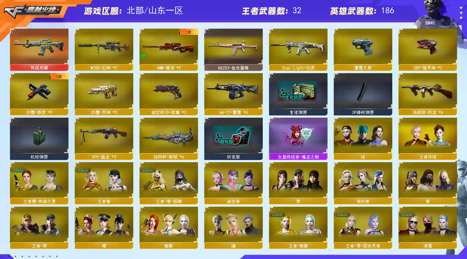 北部号 305V🔥传说光耀/幻神/朱雀/白虎🔥堕天神/夜魔/雷霆/网剧冠军套装🔥传奇N9/关羽皮四防【山东一区登录】【炫金稀有顶1V介意者勿租】【恶意投诉、撤单不想玩了租错号了等非帐号问题1律拉黑】【此号已备案请勿以身试法】【开挂必究账号价值超高】详细武器请看下方 【重要套装】堕天神套装/网剧冠军套装/夜魔套装/雷霆套装/四防角色 【重要角色】_瞳/_炫/审判者/_零/_凌霄/_葵/_樱/_迷迭香/魅影/王者-葵-貂蝉/王者樱-热浪之夏/王者-魅影/王者-零-国色天香/王者-瞳-闭月羞花/王者玲珑/王者春/王者-零/雅典娜/_炽天使/铁骑荣耀/樱-缤纷夏日/铁骑-乘风破浪/空/零-水下丽影/灵狐者-黄金海岸 【传说武器】传说光耀 【英雄武器】_M200-幻神(2)/王者幻神-觉醒版/Barrett-毁灭(4)/Barrett-极光(3)/Barrett-朱雀/barrett-金色蔷薇/雷霆之怒/王者之怒-觉醒版/王者之光-觉醒版/AWM-天龙/AWM-裁决(2)/王者之力-觉醒版/王者之决-觉醒版/M4A1-堕天神/M4A1-青龙/M4A1-雷神/M4A1-黑龙(2)/M4A1-龙血/M4A1-千变/M4A1-黑骑士(4)/M4A1-武圣(3)/M4A1-夜魔/M4A1-雷霆/M4A1-猎神(2)/M4A1-玫瑰精灵(8)/王者之魄-觉醒版/王者之武-觉醒版/王者之势-觉醒版/王者冰魄-觉醒版/王者之幻-觉醒版/HK417-朱雀/_Scar Light-白虎/AK12-天启(3)/AK47-火麒麟(4)/王者炎心-觉醒版/AK47-无影/AK47-麒麟/AK47-黑鲨(2)/AK47-黑武士/黑武士-CF网剧冠军/AK-47-猩红传说/AK47-机械迷城/AK47-B-战士/AK47-B-战神/AN94-超新星/QBZ03-金色蔷薇/王者之心-觉醒版/9A91-烈火(5)/RPK-盘龙(3)/汤姆逊-烈龙(6)/AA-12-雷霆(4)/加特林-炼狱(6)/COP-堕天神(2)/雷霆之契/沙鹰-天神(3)/天神-CF网剧冠军/沙鹰-修罗(9)/王者之魂-觉醒版/破空枪刃-夜魔(3)/麒麟刺(2)/麒麟刺-堕天神(2)/龙啸-堕天神/王者之啸-觉醒版(5)/擎天(3)/擎天-CF网剧冠军/王者之击-觉醒版/屠龙(6)/雷霆之锋/王者之锋-觉醒版(2)/马来剑-夜魔/高爆手雷-雷霆(7)/高爆手雷-夜魔(7)/高爆手雷-堕天神(7)/烟雾弹-雷霆(7)/烟雾弹-夜魔(7)/烟雾弹-堕天神(7)/闪光弹-雷霆(7)/闪光弹-夜魔(7)/闪光弹-堕天神(7) 【王者武器】王者之心/王者之翼/王者之戮/王者之城/王者之鲨/王者之怒(2)/王者之灵(2)/王者之锋/王者之刺 【小人枪】火麒麟-灵狐/M4A1-雷神-精英刀锋/C.A.T/AWM-灵狐-15周年嘉年华/巴雷特-零-水下丽影(3)/COP-旗袍(2)/魔能飞环-曼陀罗/闪光弹-小乔 【其他重要武器】炫金骑士(3)/炫金火麒麟/炫金黑龙/炫金天龙/炫金毁灭/炫金修罗/M4A1-十二生肖·龙-雷神/火麒麟-能量核心/HK417-赤血龙魂(3)/M14EBR-赤血龙魂(2)/M4A1-SS-枪王排位/AK47-枪娘/AK47-破空冰刃(3)/M4A1-Guitar 炫彩/AK47-圣诞节[2019]/M4A1-狂欢-CFS(3)/AK47-狂欢-CFS/M14EBR-情人节2020/AK47枪王排位II/AK47-SS-枪王排位(2)/M4A1-秘银赤龙(8)/AK-47-二次元/M4A1-电音/黄金AK-47/火麒麟-桃园结义/AK47-雷蛇/AK47-B-十周年(2)/AK47-十二生肖-蛇/雷神-赛博朋克/AK47-娜塔莎/红龙AK47/巴雷特-情人节2020/暗金M200(2)/AWM-T/AWM-涂鸦/黄金AWM(2)/M82A1-红龙/Barrett-孔明/AWM-卡通/98K-烛龙/M200-赤血龙魂/破天狂龙/AWM-S/EVOIII-萌杀/Steyr TMP-CFS2020纪念版/SPAS-12-雷电核心/Anaconda-雷电核心(2)/Anaconda-炽焰核心/沙鹰-枪王排位(2)/COP 357-青龙/新USP-枪王排位奖励(2)/愤怒公牛左轮-枪王排位(2)/修罗-摸金校尉(2)/Anaconda-黑金神龙/COP 357--绚樱/幻影沙鹰-枪王排位/丛林匕首-枪王排位/军用铁锹-赤龙/斩神刀-御龙/虹光丛林匕首-枪王排位/蝴蝶刀-枪王排位/丛林匕首-卧龙(4)/幻影扳手-枪王排位/闪光弹-枪王排位(7)/胜利奖杯烟雾弹-枪王排位(2) 【重要武器皮肤】毁灭-CFS2020/毁灭-星空/巴雷特SV皮肤/极光-能量核心/AWM-天龙-传奇70KG/天龙-能量核心/火麒麟-CFSTAR/火麒麟-AG/火麒麟-华夏之心/火麒麟-战神关羽/火麒麟-轻羽皮肤/火麒麟-冠军之心/无影-霓裳皮肤/AK47-黑武士-361/雷神-冠军之魄/雷神-传奇N9/雷神-虎将/黑骑士耀金皮肤/黑骑士-暗月/黑龙-暗月/黑龙-能量核心/M4A1-黑龙-361/战神-流金岁月皮肤/战神-紫绶金章皮肤/烈龙-星空/修罗-能量核心 【重要光效】Barrett-极光金色光效/M4A1-黑龙金色光效/王者之光金色光效/王者之击金色光效/王者之力金色光效/王者之啸金色光效/王者之幻金色光效/王者之怒金色光效/王者之魂金色光效/王者之魄金色光效/AK47-黑武士蓝色光效/AN94-超新星蓝色光效/巴雷特-毁灭蓝色光效/沙鹰-修罗蓝色光效/AK47-火麒麟蓝粉色光效/AK47-黑武士蓝粉色光效/M4A1-雷神蓝粉色光效/M4A1-黑骑士蓝粉色光效/M4A1-黑龙蓝粉色光效/Barrett-极光蓝粉色光效/Barrett-毁灭蓝粉色光效/沙鹰-修罗蓝粉色光效/加特林-炼狱蓝粉色光效/麒麟刺蓝粉色光效/AK47-黑武士紫橙光效/M4A1-雷神紫橙光效/王者之势紫色光效/王者之心紫色光效/王者之武紫色光效/屠龙蓝粉色光效 【重要音效卡】Barrett-极光音效卡/M4A1-黑骑士音效卡/M4A1-黑龙音效卡/M4A1-雷神音效卡/Barrett-毁灭音效卡/AK47-火麒麟音效卡 【重要戒指】15周年限定戒指/龙眼(死神)/龙眼(鹰)/16赛季纪念戒指-枪王耀金/17赛季纪念戒指-耀金/20赛季纪念戒指-耀金/21赛季纪念戒指-耀铜(食指)/21赛季纪念戒指-耀银(拇指)/22赛季纪念戒指-耀银(拇指)/23赛季纪念戒指-耀银(拇指)/24赛季纪念戒指-耀银(拇指);RPK-盘龙,QBZ03-金色蔷薇,M200-幻神,Scar Light-白虎,