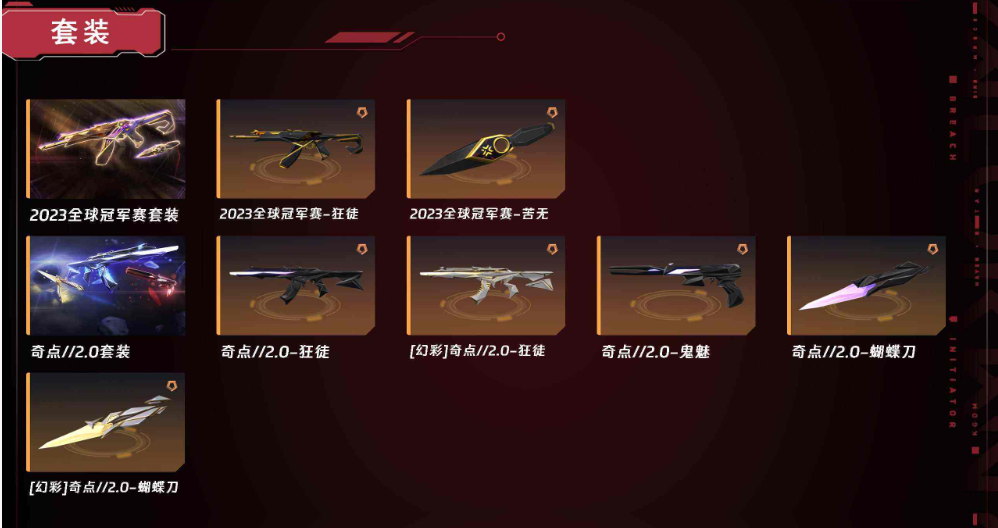 【拥有套装】奇点2.0套装(奇点//2.0-狂徒,奇点//2.0-鬼魅,奇点//2.0-蝴蝶刀)2023全球冠军赛套装(2023全球冠军赛-狂徒,2023全球冠军赛-苦无) 【拥有近战武器】离火刃,巨神铁甲-短剑,祜刀,神罚-军刀,超限闪存-匕首,超能偶像-应援棒,流星兵团-短剑,钢轨卫士-战锤,沙尘幻旅-匕首,弧光异彩-军刀,合金战车-军刀,落英飞旋,破败王者之残刃,剥皮小刀, 【拥有步枪】千灵华绽-幻影,塑水宗-狂徒,砰砰X特攻队-幻影,堕天遗武-狂徒,紫阙金琅-狂徒,盖亚的复仇-狂徒,灵魂冲击-幻影,海洋之星-狂徒,MK.VII-自由强袭-狂徒,巨神铁甲-狂徒,巨神铁甲-幻影,超限闪存-幻影,超能偶像-狂徒,超能偶像-戍卫,流星兵团-狂徒,珍珠棘贝-戍卫,钢轨卫士-狂徒,钢轨卫士-戍卫,沙尘幻旅-狂徒,噬源兽防卫工程-幻影,弧光异彩-獠犬,弧光异彩-狂徒,合金战车-幻影,模拟赫兹-獠犬,浮光跃金-戍卫,聚合之力-幻影,采蜜小蜂队-獠犬,战术熊与伙伴们-戍卫,复古浪潮-獠犬,战术小伙伴-獠犬,战术小伙伴-幻影,胡桃狂想-獠犬,萌彩剪影-戍卫,彩梦之城-戍卫,花漾粉红-戍卫,数码咒术-獠犬, 【拥有狙击枪】光明哨兵-冥驹,无垠星环-冥驹,超限闪存-莽侠,沙尘幻旅-飞将,合金战车-飞将,沙场老兵-冥驹,模拟赫兹-冥驹,聚合之力-飞将,战术熊与伙伴们-飞将,纤云弄巧-莽侠,深海水族-莽侠,复古浪潮-冥驹,光导纤维-飞将,胡桃狂想-冥驹,信手涂鸦-飞将,花漾粉红-冥驹, 【拥有机枪】巨神铁甲-奥丁,流星兵团-奥丁,沙场老兵-战神,浮光跃金-战神,采蜜小蜂队-战神,深海水族-战神,战术小伙伴-奥丁,萌彩剪影-战神,信手涂鸦-奥丁,数码咒术-战神, 【拥有冲锋枪】紫阙金琅-骇灵,超限闪存-蜂刺,流星兵团-骇灵,珍珠棘贝-骇灵,沙尘幻旅-骇灵,弧光异彩-蜂刺,合金战车-蜂刺,浮光跃金-骇灵,聚合之力-蜂刺,纤云弄巧-蜂刺,深海水族-蜂刺,光导纤维-骇灵,战术小伙伴-蜂刺,胡桃狂想-蜂刺,信手涂鸦-骇灵,花漾粉红-骇灵, 【拥有霰弹枪】超能偶像-判官,模拟赫兹-雄鹿,采蜜小蜂队-判官,复古浪潮-雄鹿,萌彩剪影-判官,彩梦之城-雄鹿,数码咒术-判官, 【拥有手枪】双城之战-正义,VCT-x-AG-标配,紫阙金琅-标配,盖亚的复仇-鬼魅,巨神铁甲-狂怒,超限闪存-正义,超能偶像-标配,流星兵团-鬼魅,珍珠棘贝-狂怒,钢轨卫士-狂怒,钢轨卫士-短炮,沙尘幻旅-正义,弧光异彩-短炮,合金战车-正义,神罚-标配,超能冲撞-标配,模拟赫兹-鬼魅,浮光跃金-标配,聚合之力-狂怒,采蜜小蜂队-鬼魅,扑棱扑棱-鬼魅,纤云弄巧-正义,战术熊与伙伴们-狂怒,战术熊与伙伴们-标配,纤云弄巧-短炮,深海水族-短炮,光导纤维-鬼魅,光导纤维-标配,萌彩剪影-狂怒,胡桃狂想-鬼魅,彩梦之城-标配,信手涂鸦-鬼魅,数码咒术-鬼魅,花漾粉红-狂怒,24冠军混沌黯夜怪谈艾沃莉源能者电玩显卡套塑水宗归零者盖世套光明哨兵机动狂飙全息波普破败军械掠夺掠影无畏奇点2.0白银青铜黄金黑铁砖石铂金神话盖亚洪荒离火刃毁灭骑士VCT爪刀创纪元镭切虚空遗器离子2.0西部未来蝴蝶刀黑波显卡AK无畏光荣异象RGX 11Z PRO奇点正义23盖亚铂金22冠军苍龙之刃21冠军超时空卫士掠影2.0影钩赋能掠夺爪显卡AK滋滋X特工队25冠军;离火刃,剥皮小刀,盖亚的复仇 狂徒,紫阙金琅 狂徒,堕天遗武 狂徒,塑水宗 狂徒,2023全球冠军赛 狂徒,