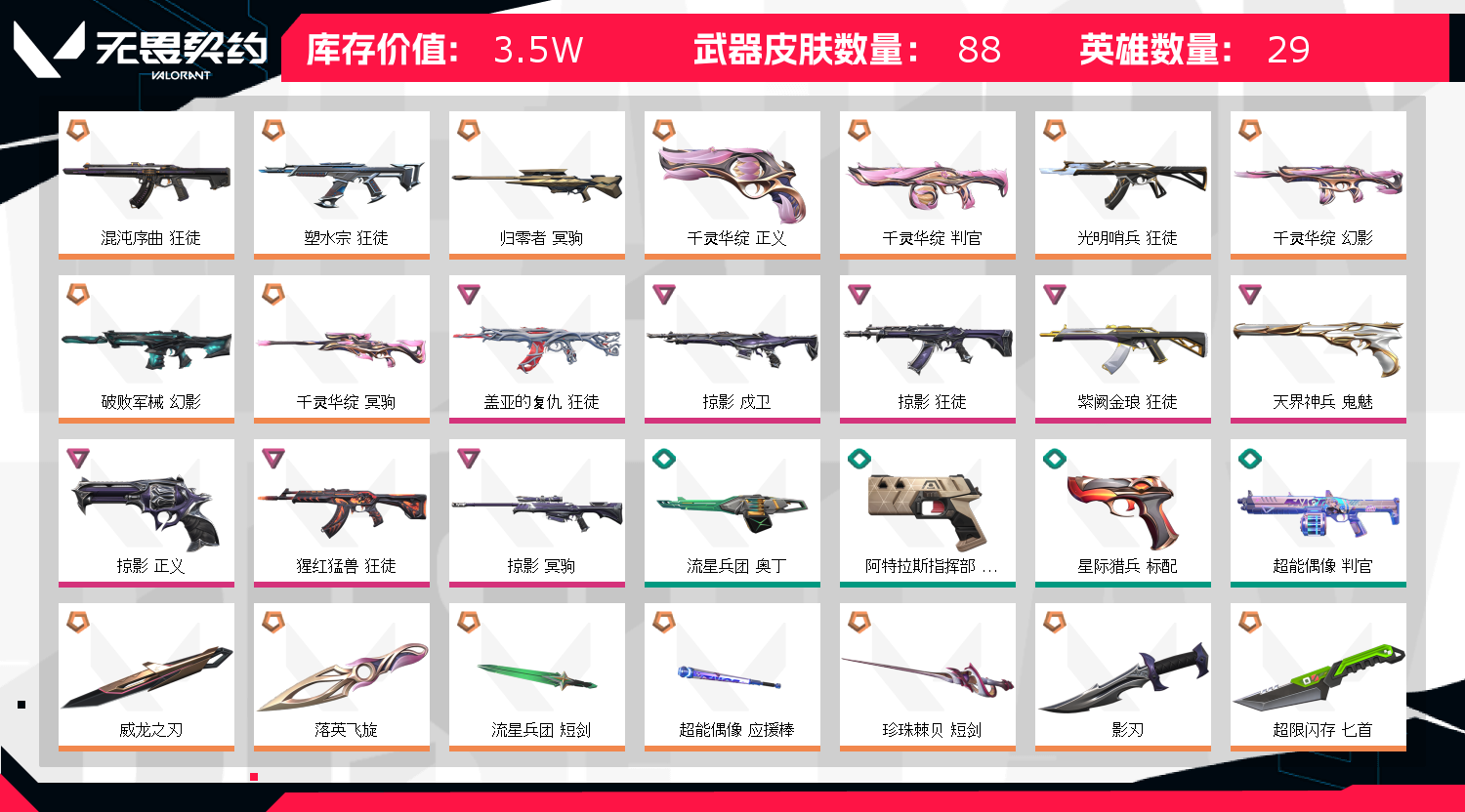 喜欢的老板,麻烦点点收藏,下次租玩更便利,持续更新皮肤中~~~ 【拥有套装】千灵华绽套装(千灵华绽-幻影,千灵华绽-冥驹,千灵华绽-判官,千灵华绽--正义,落英飞旋)掠影套装(掠影-狂徒,掠影-冥驹,掠影-戍卫,掠影-正义,影刃) 【拥有近战武器】超限闪存-匕首,超能偶像-应援棒,流星兵团-短剑,珍珠棘贝-短剑,威龙之刃, 【拥有步枪】光明哨兵-狂徒,混沌序曲-狂徒,破败军械-幻影,塑水宗-狂徒,紫阙金琅-狂徒,猩红猛兽-狂徒,盖亚的复仇-狂徒,耀鳞威龙-狂徒-,超限闪存-幻影,超能偶像-戍卫,超能偶像-狂徒,流星兵团-狂徒,珍珠棘贝-戍卫,珍珠棘贝-幻影,模拟赫兹-獠犬,浮光跃金-戍卫,聚合之力-幻影,采蜜小蜂队-獠犬,战术熊与伙伴们-戍卫,复古浪潮-獠犬, 【拥有狙击枪】归零者-冥驹,超限闪存-莽侠,模拟赫兹-冥驹,聚合之力-飞将,战术熊与伙伴们-飞将,纤云弄巧-莽侠,深海水族-莽侠,复古浪潮-冥驹, 【拥有机枪】流星兵团-奥丁,浮光跃金-战神,采蜜小蜂队-战神,深海水族-战神, 【拥有冲锋枪】超限闪存-蜂刺,流星兵团-骇灵,珍珠棘贝-骇灵,合金战车-蜂刺,浮光跃金-骇灵,聚合之力-蜂刺,纤云弄巧-蜂刺,深海水族-蜂刺,花漾粉红-骇灵, 【拥有霰弹枪】超能偶像-判官,模拟赫兹-雄鹿,采蜜小蜂队-判官,复古浪潮-雄鹿,数码咒术-判官, 【拥有手枪】天界神兵-鬼魅,超限闪存-正义,超能偶像-标配,流星兵团-鬼魅,珍珠棘贝-狂怒,合金战车-正义,超能冲撞-标配,宿怨-鬼魅,模拟赫兹-鬼魅,浮光跃金-标配,聚合之力-狂怒,采蜜小蜂队-鬼魅,纤云弄巧-正义,战术熊与伙伴们-狂怒,战术熊与伙伴们-标配,纤云弄巧-短炮,复古浪潮-正义,深海水族-短炮,花漾粉红-狂怒,24冠军混沌黯夜怪谈艾沃莉源能者电玩显卡套塑水宗归零者盖世套光明哨兵机动狂飙全息波普破败军械掠夺掠影无畏奇点2.0白银青铜黄金黑铁砖石铂金神话盖亚洪荒离火刃毁灭骑士VCT爪刀创纪元镭切虚空遗器离子2.0西部未来蝴蝶刀黑波显卡AK无畏光荣异象RGX 11Z PRO奇点正义23盖亚铂金22冠军苍龙之刃21冠军超时空卫士掠影2.0影钩赋能掠夺爪显卡AK滋滋X特工队25冠军;威龙之刃,盖亚的复仇 狂徒,掠影 戍卫,掠影 狂徒,紫阙金琅 狂徒,混沌序曲 狂徒,塑水宗 狂徒,