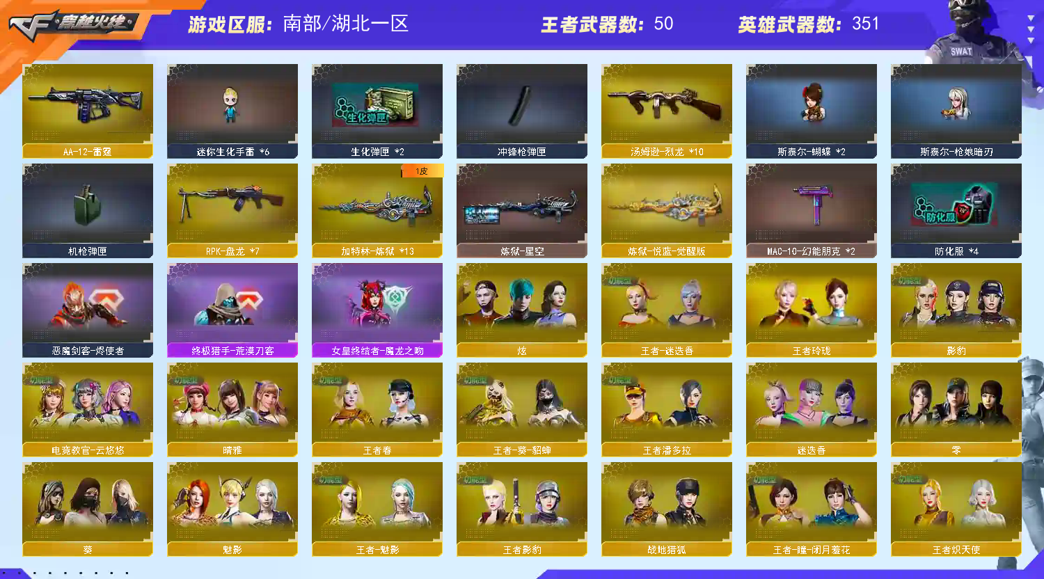 【重要套装】幻灵套装/竞技荣光套装/夜魔套装/雷暴套装/小红蛙套装 【重要角色】传说影煞/传说女帝/炫/晴雅/影豹/迷迭香/魅影/零/隼/葵/电竞教官-云悠悠/王者-迷迭香/王者春/王者玲珑/王者炽天使/王者潘多拉/王者影豹/王者-瞳-闭月羞花/雅典娜/王者-魅影/王者-葵-貂蝉/王者零-传说之路/暗黑审判/乔伊教练/电竞少女/职业选手/灵狐者-职业经理/炽天使/铁骑荣耀/樱-缤纷夏日/零-水下丽影/灵狐者-黄金海岸/云海玲珑 【传说武器】传说光耀(2)/传说夜影/传说暗裔/传说灵眸/传说圣灵 【英雄武器】_M200-幻神(3)/M200-竞技荣光/王者幻神-觉醒版/Barrett-毁灭(8)/Barrett-极光(3)/Barrett-朱雀/barrett-金色蔷薇(3)/Barrett-暗月传说/王者之怒-觉醒版/王者之光-觉醒版/Kar98K-星神/AWM-天龙(11)/AWM-裁决(4)/王者之力-觉醒版/王者之决-觉醒版/M4A1-青龙(2)/M4A1-雷神(9)/M4A1-死神(2)/M4A1-黑龙(10)/M4A1-龙血(15)/M4A1-千变(2)/M4A1-黑骑士(7)/M4A1-武圣/M4A1-夜魔/M4A1-幻灵/M4A1-雷霆/王者之魄-觉醒版/王者之势-觉醒版(2)/王者冰魄-觉醒版/王者之幻-觉醒版/HK417-朱雀/_Scar Light-白虎/白虎之魄-觉醒版/M14EBR-玄武/AK12-天启(5)/AK47-火麒麟(7)/AK47-无影(8)/无影-神兵利器/AK47-雷暴/AK47-黑鲨(13)/AK47-黑武士(9)/AK-47-猩红传说(3)/AK47-B-身先士卒/AK47-B-常胜将军/AK47-B-战士(2)/AK47-B-战神/AN94-超新星/QBZ03-金色蔷薇(2)/王者之心-觉醒版(2)/超新星-悦享-觉醒版/王者之翼-觉醒版/王者之鲨-觉醒版(2)/9A91-烈火(4)/王者之烈-觉醒版/RPK-盘龙(7)/汤姆逊-烈龙(10)/AA-12-雷霆/加特林-炼狱(13)/炼狱-悦蓝-觉醒版/COP-堕天神/COP 357-幻灵(3)/COP 357-雷霆王者-觉醒版/王者之灵-觉醒版/雷霆之契/天神-动感闪耀/沙鹰-天神(5)/沙鹰-修罗(9)/王者之魂-觉醒版/Glock18-武圣/破空枪刃-夜魔/柯尔特-电竞装甲/柯尔特-竞技荣光(2)/USP-雷暴/麒麟刺(3)/麒麟刺-堕天神/王者之刺-觉醒版/龙啸(24)/王者之啸-觉醒版/擎天(5)/擎天-CF网剧冠军/擎天-竞技荣光/王者之击-觉醒版(3)/屠龙(5)/雷霆之锋/幻灵之锋(2)/王者之锋-觉醒版/马来剑-夜魔/斩神刀-雷暴/炽芒蝶刃(2)/手雷-动感闪耀/高爆手雷-神工天巧/高爆手雷-幻灵(7)/高爆手雷-雷暴(5)/高爆手雷-雷霆(7)/高爆手雷-夜魔(5)/高爆手雷-堕天神/高爆手雷-竞技荣光/烟雾弹-幻灵(7)/烟雾弹-雷暴(5)/烟雾弹-雷霆(7)/烟雾弹-夜魔(5)/烟雾弹-堕天神/烟雾弹-竞技荣光/烟雾弹-电竞装甲/恶棍-电竞装甲/闪光弹-神工天巧/闪光弹-幻灵(8)/闪光弹-雷暴(5)/闪光弹-雷霆(7)/闪光弹-夜魔(5)/闪光弹-堕天神/闪光弹-竞技荣光/闪光弹-电竞装甲/黑武士-锦绣游龙/王者芳薇-觉醒版/黑骑士-专属/王者风神-觉醒版/烈龙-云海游龙/擎天-云海游龙/手雷-云海游龙 【王者武器】王者之武(2)/王者之魄/王者之戮(2)/玫瑰精灵-悦动/王者之心/王者之势/王者之翼/王者之怒(2)/王者之魂/王者之锋/王者之魄闪光弹(3)/王者之魄烟雾弹(2)/王者之魄高爆手雷(2) 【小人枪】M4A1-雷神-精英刀锋(2)/火麒麟-绝迹/火麒麟-灵狐/雷神-小红(2)/AWM-灵狐-15周年嘉年华(2)/斯泰尔-蝴蝶(2)/斯泰尔-枪娘暗刃/COP-旗袍/降世魔童/迷你深渊冰龙/魔能飞环-曼陀罗(2)/迷你波特博士/迷你裂空之翼/迷你牛牛/迷你深渊冰龙-王绿豆/迷你宝贝/闪光弹-小乔/迷你生化手雷(2)/灵狐娃娃手雷(2)/生化手雷-机甲核心(2)/深渊终结者手雷/高爆手雷-大乔/闪光弹-貂蝉 【其他重要武器】炫金骑士(6)/炫金黑龙/炫金雷神(4)/炫金火麒麟/炫金武士/炫金毁灭(2)/炫金修罗(3)/黑武士-能量核心/冰龙粉碎者-白马银枪/机甲撕裂者III(2)/激光毁灭者III(2)/激光毁灭者I/AK47-万圣节2018/联想锋行黄金AK/红龙AK47(2)/M4A1-万圣节2020/黄金AK-47/M4A1-秘银赤龙/AK-12-CFS2017纪念版/雷神-赛博朋克/Scar-Light-赤血龙魂/AK47-青龙/M14EBR-赤血龙魂/M14EBR-情人节2020/M4A1-S-十周年/M4A1-电音(2)/M4A1-Guitar 炫彩/M4A1-水枪-机甲核心/M14EBR-炎龙/AN94-青花瓷/AK47-大帝林肯/AK47-苍龙(2)/AK103-神秘黑洞/M4A1-紫炎/QBZ03-锋芒破茧(2)/M14EBR-朋克/AK47-QT/AK47-丹龙/AWM-卡通/98K-蓝色骑士/M200-圣诞/M200-万圣节2018/破天狂龙/AWM-万圣节刀锋/M200-情人节2019/M200-万圣节/AWM-Red/Barrett-耀龙/Barrett-麟龙/AWM-7周年/M82A1-夏日/AWM-A/巴雷特-情人节2020/M200-WeGame/M200-萌杀/M82A1-飞龙在天/M82A1-水枪/Barrett-捣乱兔兔/Barrett-苍龙/AWM-蓝水晶/M200-枪王排位/AWM-小故障/M200-赤血龙魂/M200-青花瓷/Barrett-孔明/AWM-Pink/M200-神秘黑洞/凤凰之力/巨龙咆哮Ⅲ/KAC-耀龙/KAC-小动物/致命乱世-超越Max/斯太尔-能量核心/CPW-动力-潘多拉/P90-炫彩/斯泰尔-巧克力/神圣爆裂者(2)/征服者-毁灭之王 [Lv Max]/征服者-寒冰之狱 [Lv Max]/神圣爆裂者-末日/AA-12-圣龙/SPAS-12-雷电核心/阐释者III/Anaconda-黑金神龙/沙鹰-万圣节2018/愤怒公牛左轮-枪王排位/沙漠之鹰-炎龙/COP 357-青龙/沙鹰-青龙/沙鹰-雷蛇/Anaconda-炽焰核心/COP-金蝉子-枪王排位(2)/幻影Anaconda-枪王排位/Anaconda-雷电核心(2)/幻影沙鹰-枪王排位(2)/Colt1911-彩蝶/Cop357-萌杀(2)/MAC-10-幻能朋克/愤怒的公牛-朋克/沙鹰-枪王排位/COP-机甲刑天/新USP-枪王排位奖励/幻影扳手-枪王排位(2)/斩神刀-御龙/唐刀-九五至尊/军用铁锹-飞龙在天/丛林匕首-卧龙/军用铁锹-赤龙/幻影双斧-枪王排位/蝴蝶刀-枪王排位/尼泊尔-庆典-CFS 2021/魔能镰刀/丛林匕首-枪王排位/雷神之怒-机甲核心/虹光丛林匕首-枪王排位/猫猫手套(2)/Knife-冠军之刃/红色诅咒娃娃手雷/胜利奖杯闪光弹-枪王排位(2)/胜利奖杯手雷-枪王排位/胜利奖杯烟雾弹-枪王排位/烟雾弹-