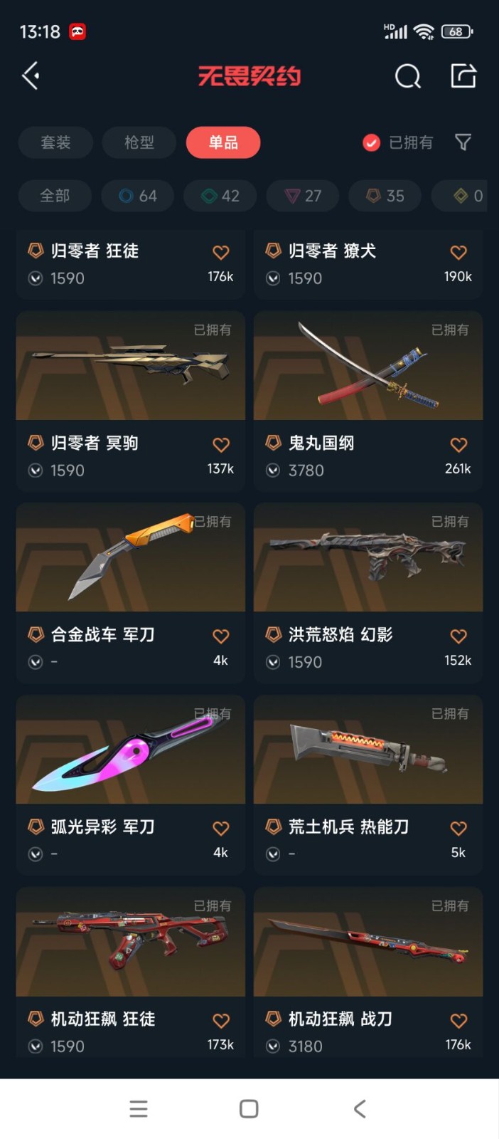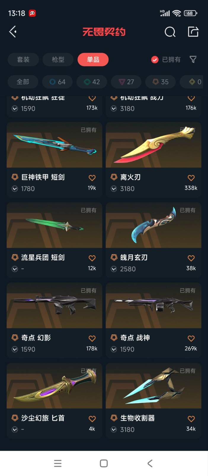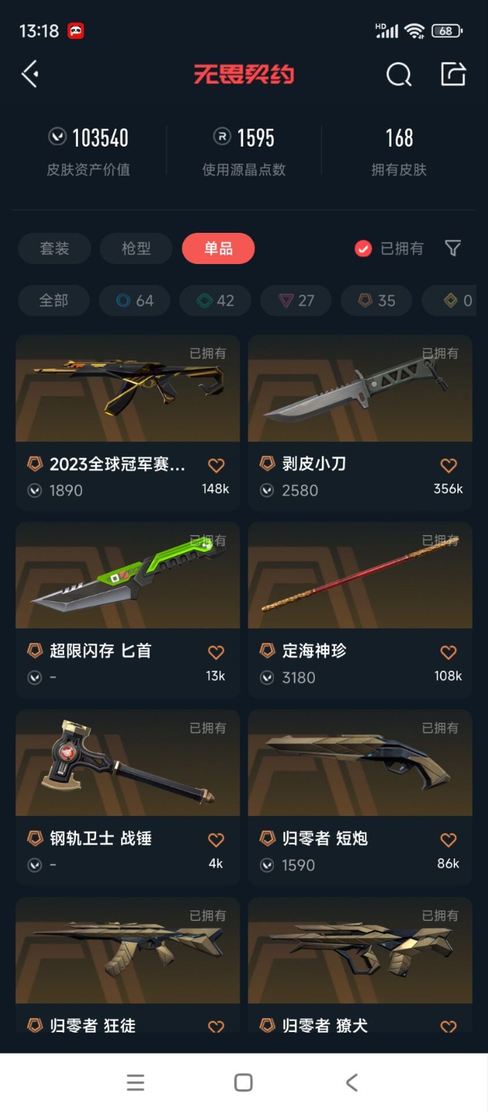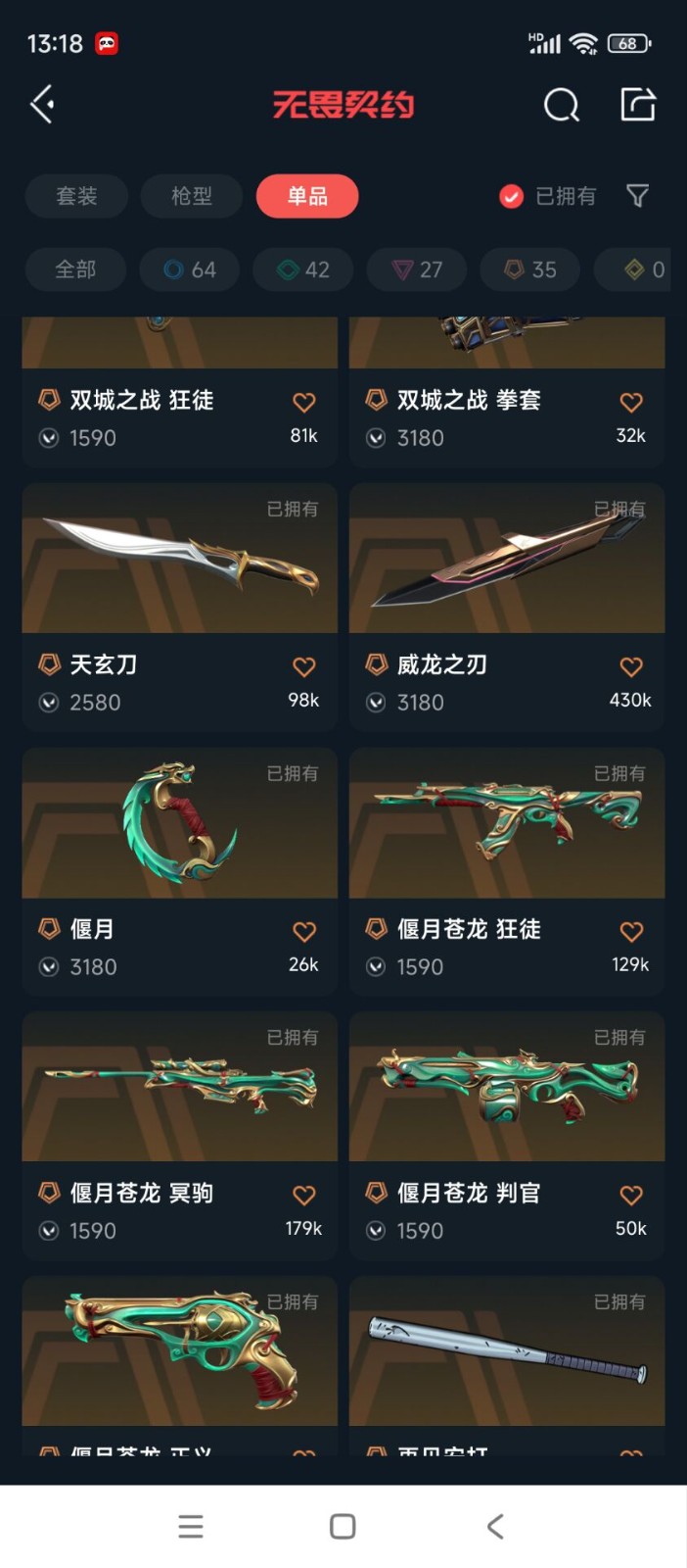 【拥有套装】双城之战套装(双城之战-狂徒,双城之战-拳套)般若假面2.0套装(般若假面//2.0-狂徒,般若假面//2.0-獠犬,般若假面//2.0-战神,般若假面//2.0-狂怒,鬼丸国纲)归零者套装(归零者-獠犬,归零者-狂徒,归零者-冥驹,归零者-短炮,生物收割器)偃月苍龙套装(偃月苍龙-狂徒,偃月苍龙-冥驹,偃月苍龙-判官,偃月苍龙-正义,偃月)天界神兵套装(天界神兵-戍卫,天界神兵-飞将,天界神兵-蜂刺,天界神兵-鬼魅,天玄刀)盖世英雄套装(盖世英雄-狂徒,盖世英雄-冥驹,盖世英雄-战神,盖世英雄-鬼魅,定海神珍)耀鳞威龙套装(耀鳞威龙-狂徒,耀鳞威龙-鬼魅,威龙之刃)源能者危机001套装(源能者危机001-幻影,源能者危机001-骇灵,源能者危机001-雄鹿,源能者危机001-标配,再见安打)