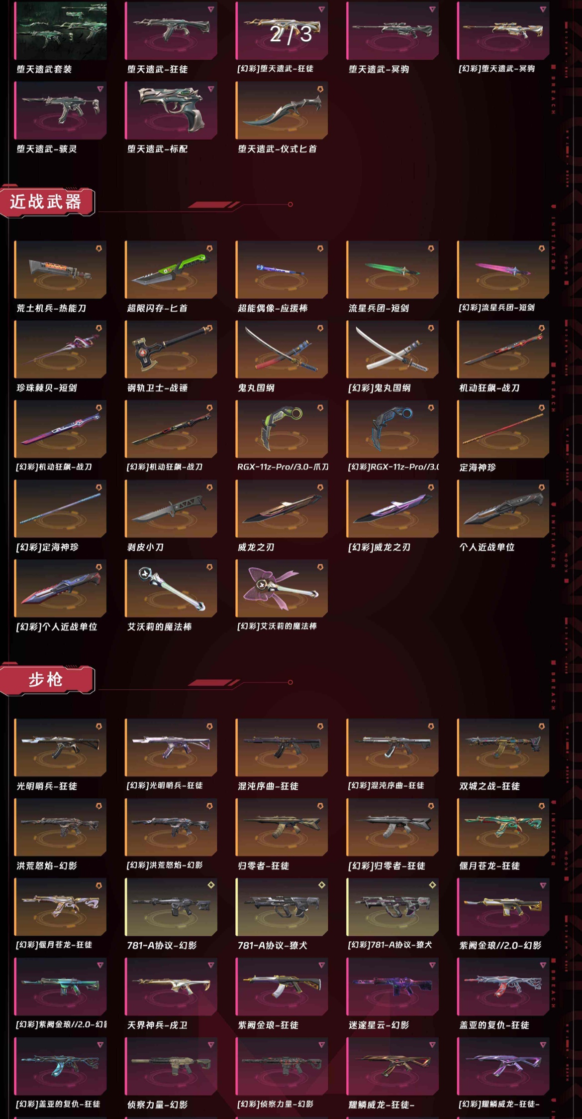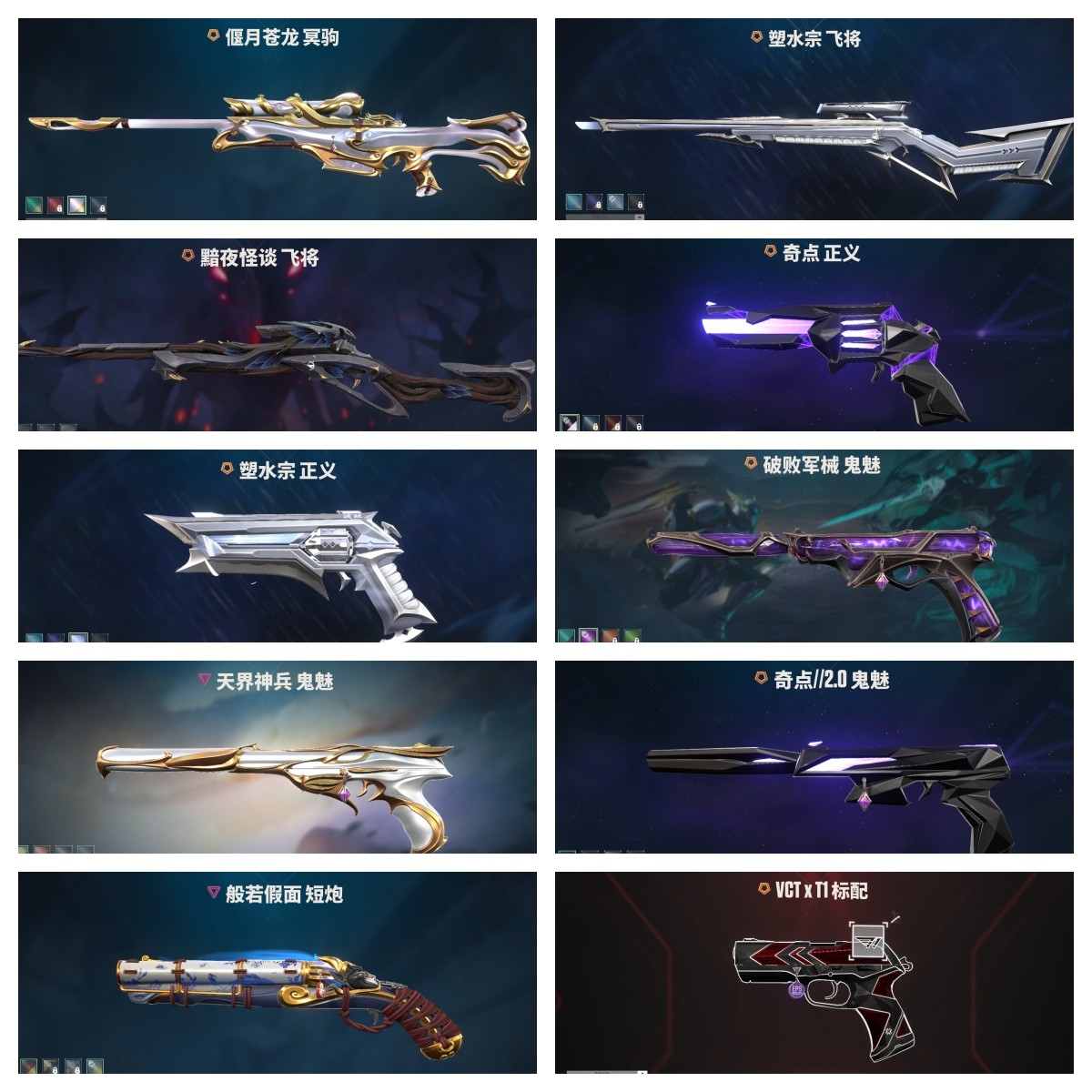 【拥有手枪】VCT-x-T1-标配,奇点-正义,天界神兵-鬼魅,般若假面-短炮,荒土机兵-标配,超限闪存-正义,超能偶像-标配,流星兵团-鬼魅,珍珠棘贝-狂怒,钢轨卫士-狂怒,钢轨卫士-短炮,纳米-正义,逆冲蛮牛-狂怒,模拟赫兹-鬼魅,浮光跃金-标配,聚合之力-狂怒,采蜜小蜂队-鬼魅,纤云弄巧-正义,战术熊与伙伴们-狂怒,纤云弄巧-短炮,战术熊与伙伴们-标配,复古浪潮-正义,深海水族-短炮,光导纤维-鬼魅,光导纤维-标配,24冠军混沌黯夜怪谈艾沃莉源能者电玩显卡套塑水宗归零者盖世套光明哨兵机动狂飙全息波普破败军械掠夺掠影无畏奇点2.0白银青铜黄金黑铁砖石铂金盖亚洪荒离火刃毁灭骑士VCT爪刀创纪元镭切虚空遗器离子2.0西部未来蝴蝶刀黑波显卡AK无畏光荣异象RGX 11Z PRO奇点正义23盖亚铂金22冠军苍龙之刃21冠军超时空卫士掠影2.0影钩赋能掠夺爪显卡AK滋滋X特工队25冠军;砰砰X特攻队 奥丁,奇点 战神,黑波之刃,剥皮小刀,威龙之刃,起源 雄鹿,盖亚的复仇 狂徒,
