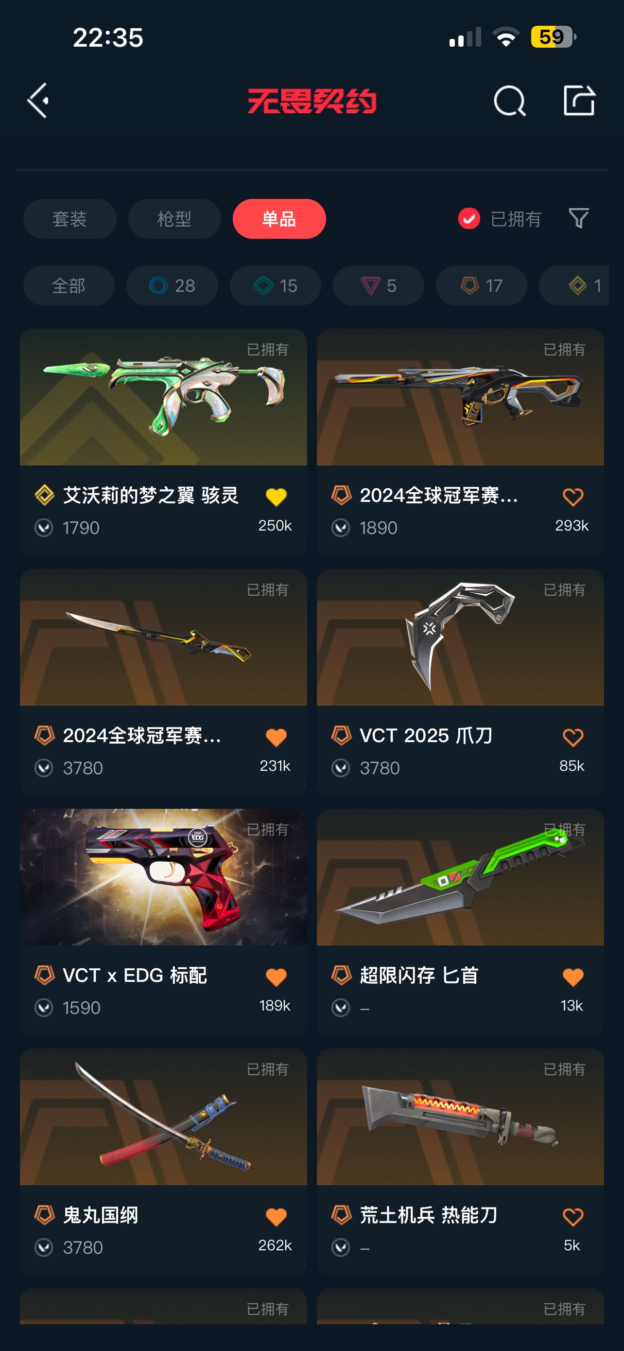 2025冠军套 英雄25 西部未来正义 塑水宗狂徒 鬼丸国纲太刀 2024冠军 VCT爪刀 掠影狂徒;VCT 2025 爪刀,虚空遗器 狂徒,掠影 狂徒,紫阙金琅 狂徒,混沌序曲 狂徒,塑水宗 狂徒,2024全球冠军赛 幻影,