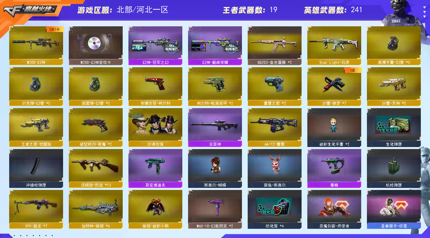 特殊武器:M200-幻神 ,Scar-白虎 ,HK417-朱雀 ,QBZ03-蔷薇 ,M4A1-雷霆 ,巴雷特-雷霆 ,COP-雷霆 ,尼泊尔-雷霆,M4A1-夜魔 ,破空枪刃-夜魔 ,马来剑-夜魔 ,巴雷特-电竞装甲,柯尔特-电竞装甲,尼泊尔-电竞装甲,荣耀世冠雷神 ,荣耀世冠龙啸 ,荣耀世冠-火麒麟 ,荣耀世冠-柯尔特 ,QBZ95-幻兽,沙鹰-幻兽,女皇利刃-幻兽;荣耀世冠-柯尔特,沙漠玫瑰,RPK-盘龙,QBZ03-金色蔷薇,M200-幻神,Scar Light-白虎,
