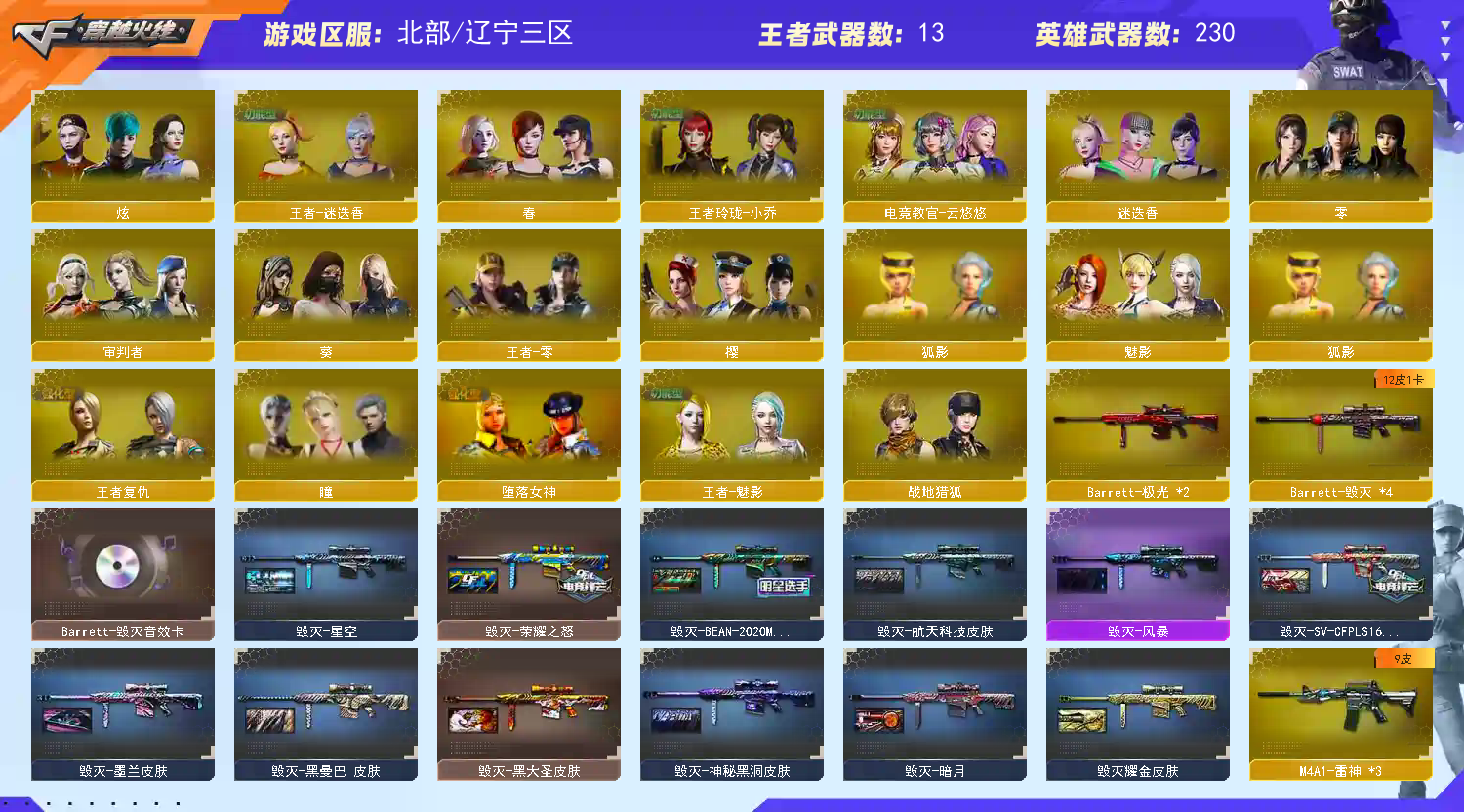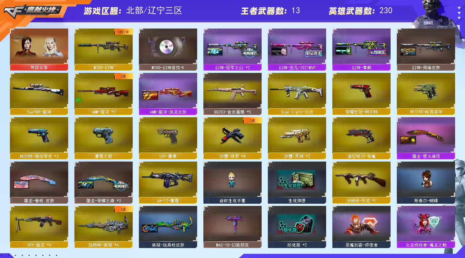 >>>>>>毁号,涉及毁坏虚拟财产罪及计算机安全罪,请文明游戏素质游戏,让我们共建美好租号平台>>>>>> 本游戏账号:英雄武器220个; 王者武器20个。 装备不多,但是主武器、副武器、近身武器够用 拥有完美游戏体验。重要的是,特殊装备有:AK47-雷暴、麒麟刺、龙啸-堕天神、烟雾弹-堕天神、闪光弹-堕天神、M4A1-玫瑰精灵、烟雾弹-神工天巧、高爆手雷-神工天巧、闪光弹-神工天巧、加特林-炼狱、M4A1-黑龙、雷霆之锋、雷霆之契、M4A1-雷霆、雷霆之怒、麒麟刺-堕天神、荣耀世冠-柯尔特、AK47-黑武士、AN94-超新星、M4A1-黑骑士、AK47-麒麟、M4A1-雷神、黑骑士-海王、Barrett-朱雀、QBZ03-金色蔷薇、Barrett-毁灭、AK47-火麒麟、M200-幻神、AA-12-雷霆、USP-雷暴、幻灵之锋、Kar98K-星神、AWM-天龙、Scar Light-白虎、擎天-竞技荣光、柯尔特-竞技荣光、破空枪刃-夜魔、M200-竞技荣光、高爆手雷-竞技荣光、闪光弹-竞技荣光、烟雾弹-竞技荣光、高爆手雷-雷霆王者、王者之锋-觉醒版、王者之光-觉醒版、炫金骑士、炫金火;
