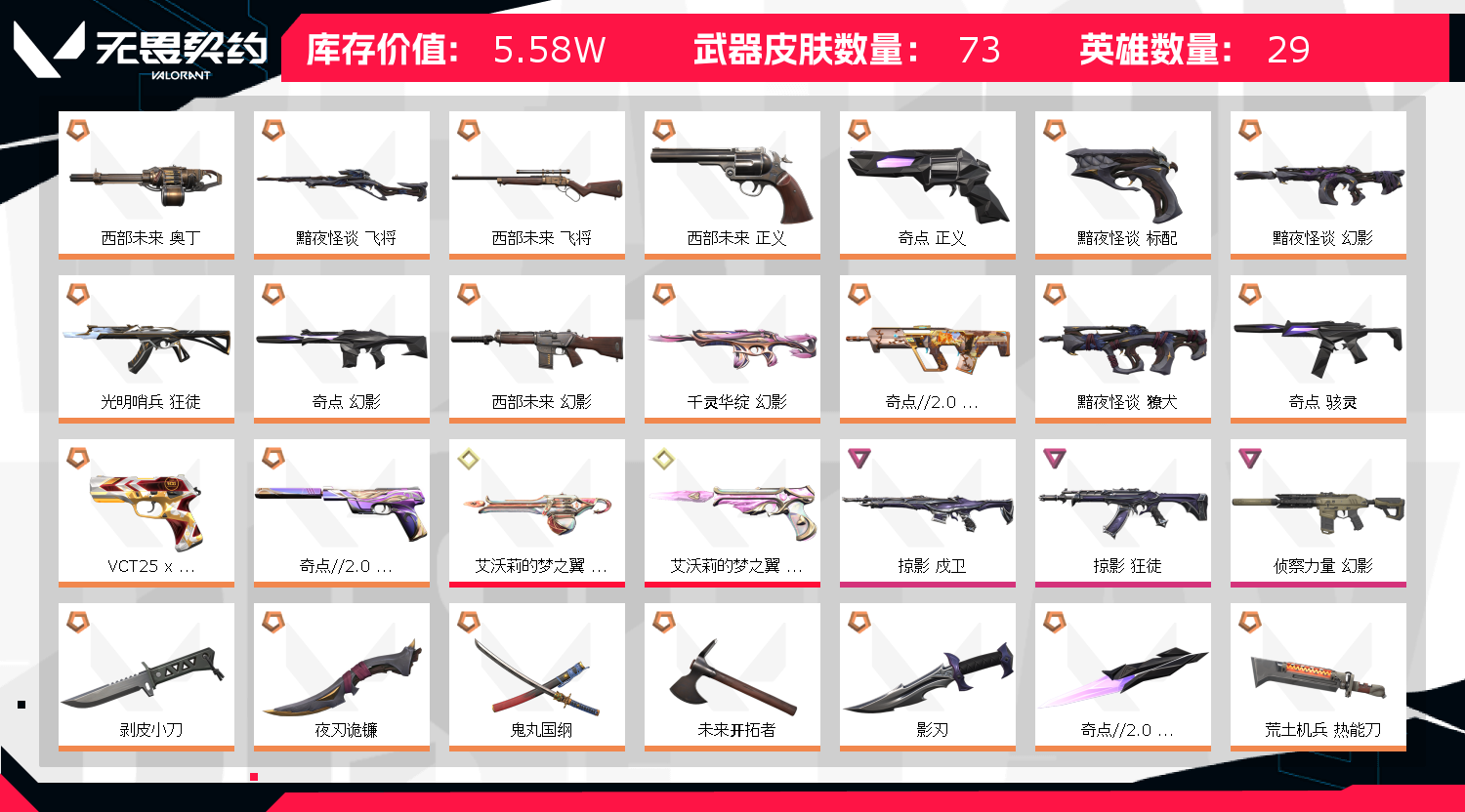 请及时续租到时间后上号器会闪退 如果点击启动游戏无反应,尝试在wegame里修复无畏契约。 玩多久租多久,但是可能会因为蓝屏的原因,导致上不去游戏,可能导致挂机,所以到时间后如果想多打两把的建议续租;艾沃莉的梦之翼 奥丁,西部未来 奥丁,剥皮小刀,掠影 戍卫,掠影 狂徒,侦察力量 幻影,紫阙金琅 狂徒,