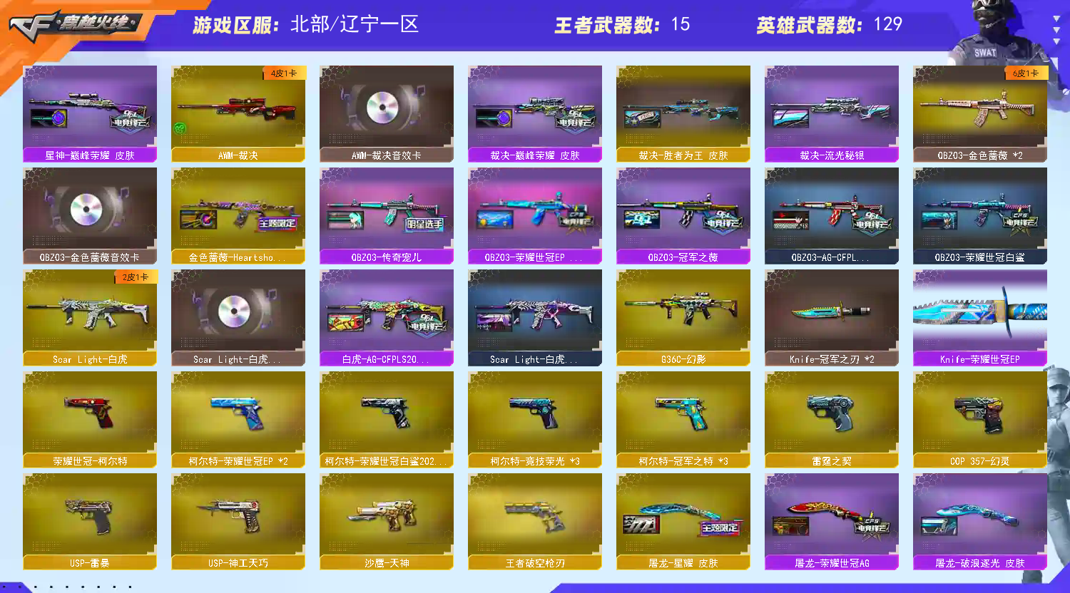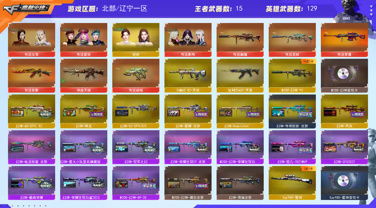 七传说,3幻神19皮(幻神2023白鲨,欧欧,星火,星耀,女团,念旧,宠儿,冠军之幻,巅峰荣耀,世冠白鲨,cfs2022,丹凤,周瑜,黄忠,降龙,电流)98k星神三件套,qbz,白虎,玄武,幻影g36c(COP,USP,科尔特);USP-雷暴,荣耀世冠-柯尔特,柯尔特-荣耀世冠白鲨2023,柯尔特-冠军之特,炽芒蝶刃,Knife-冠军之刃,传说影煞,