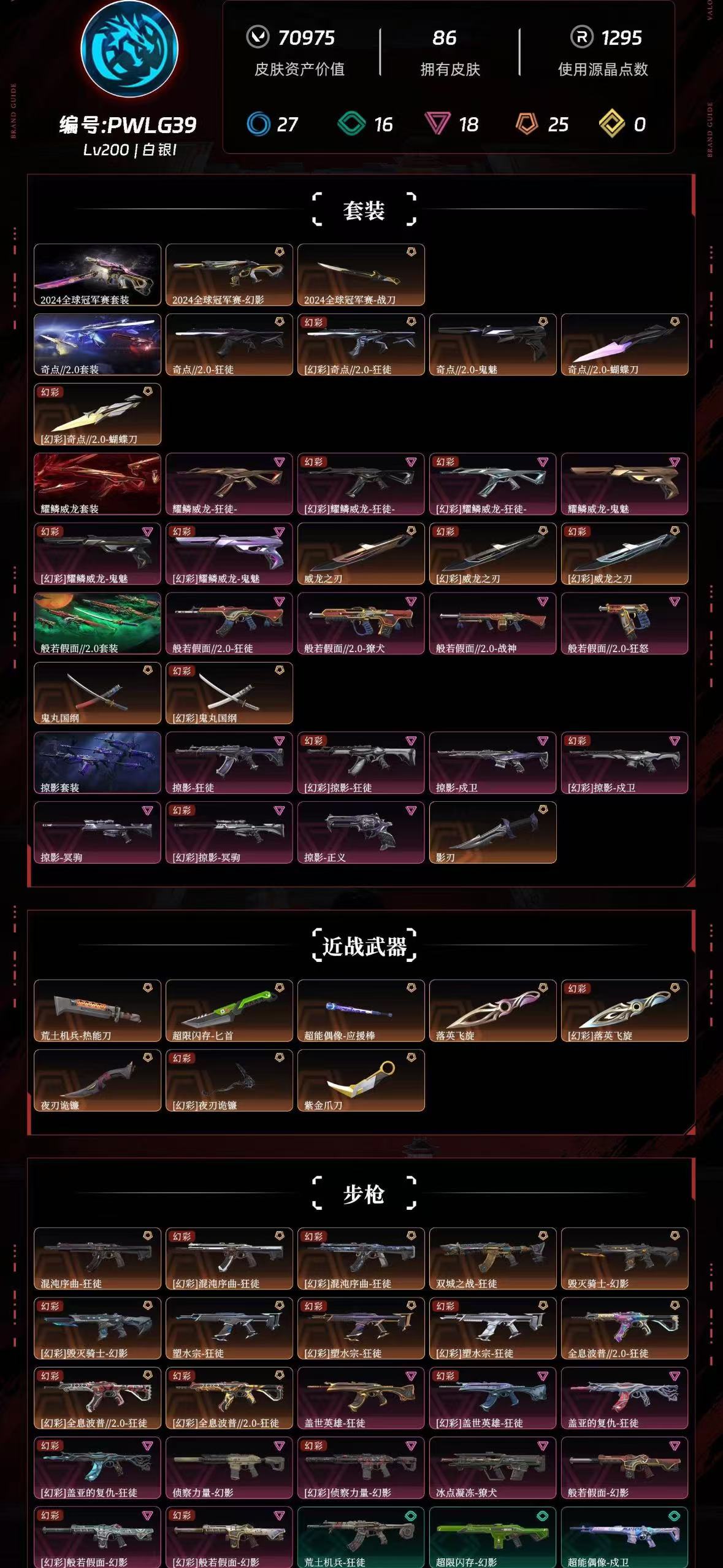 【拥有套装】奇点2.0套装(奇点//2.0-狂徒,奇点//2.0-鬼魅,奇点//2.0-蝴蝶刀)般若假面2.0套装(般若假面//2.0-狂徒,般若假面//2.0-獠犬,般若假面//2.0-战神,般若假面//2.0-狂怒,鬼丸国纲)2024全球冠军赛套装(2024全球冠军赛-幻影,2024全球冠军赛-战刀)耀鳞威龙套装(耀鳞威龙-狂徒,耀鳞威龙-鬼魅,威龙之刃)掠影套装(掠影-狂徒,掠影-冥驹,掠影-戍卫,掠影-正义,影刃)