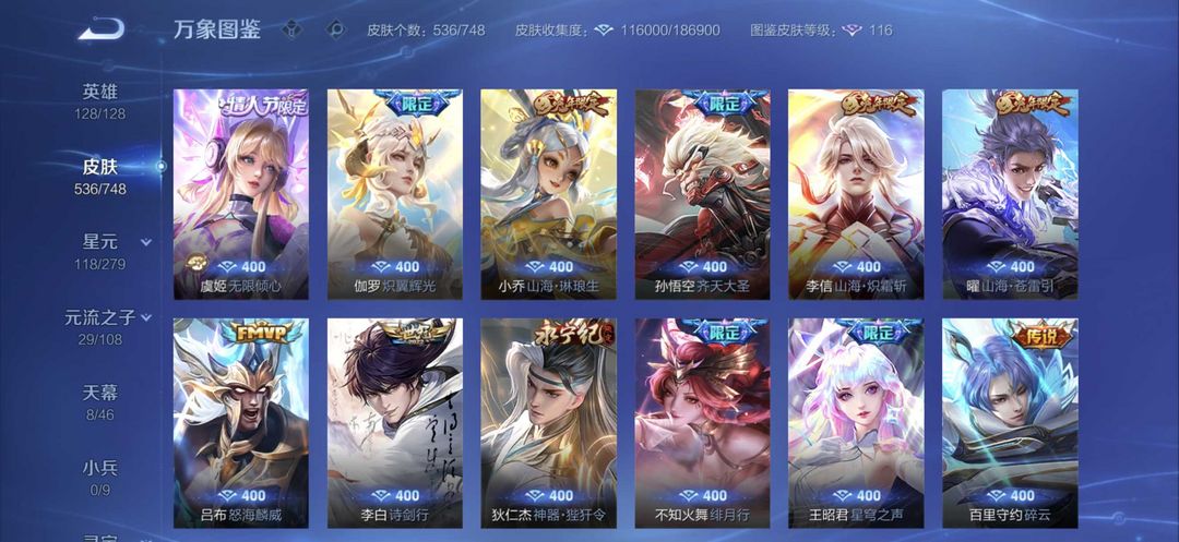 v10、509皮、刘备星传说时之思念、韩信荣耀典藏、瑶珍品传说大耳狗之梦、青丘·九尾、星域神启、画中仙、深海之息、天魔缭乱
