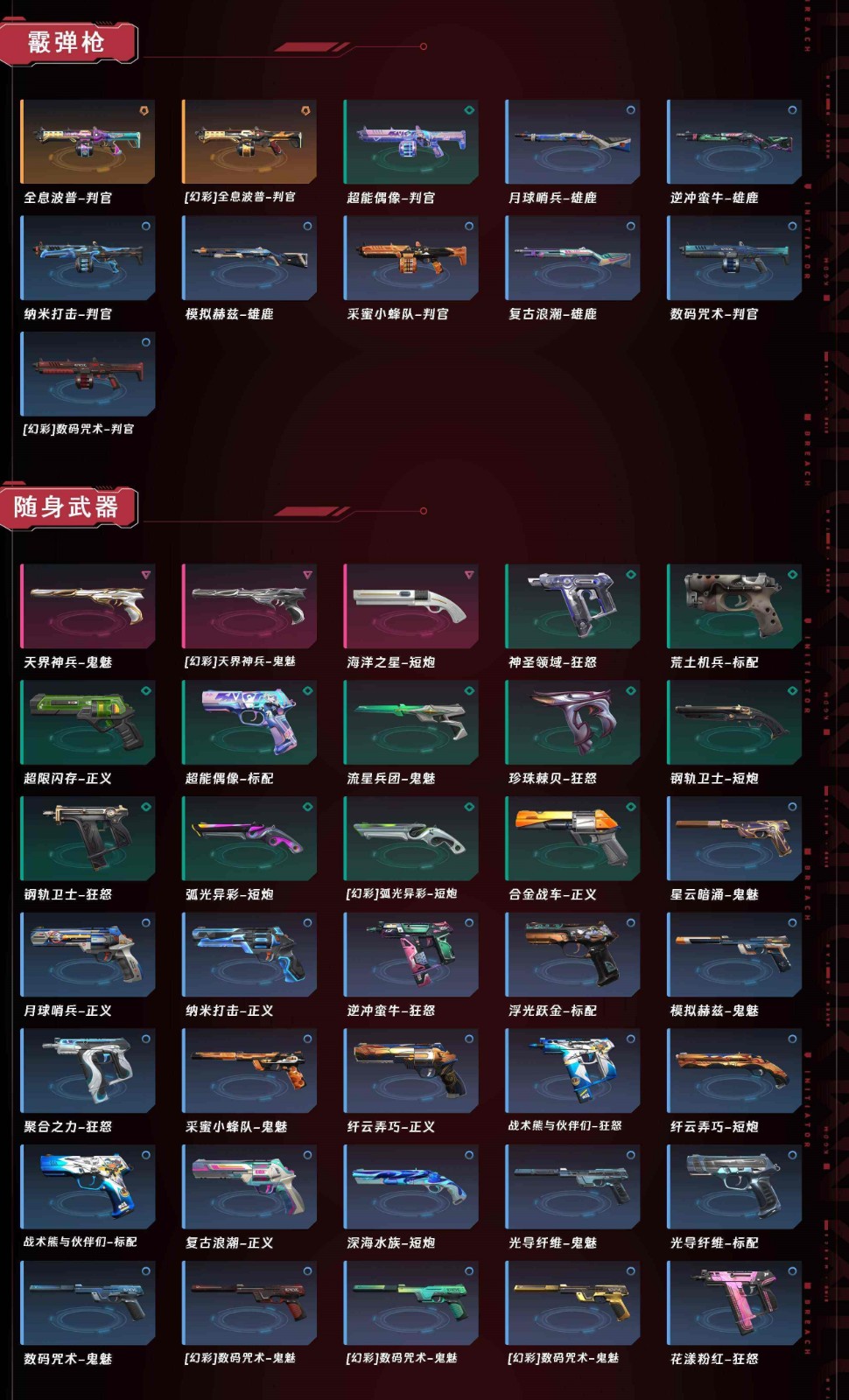 【拥有霰弹枪】全息波普-判官,超能偶像-判官,月球哨兵-雄鹿,逆冲蛮牛-雄鹿,纳米-判官,模拟赫兹-雄鹿,采蜜小蜂队-判官,复古浪潮-雄鹿,数码咒术-判官,