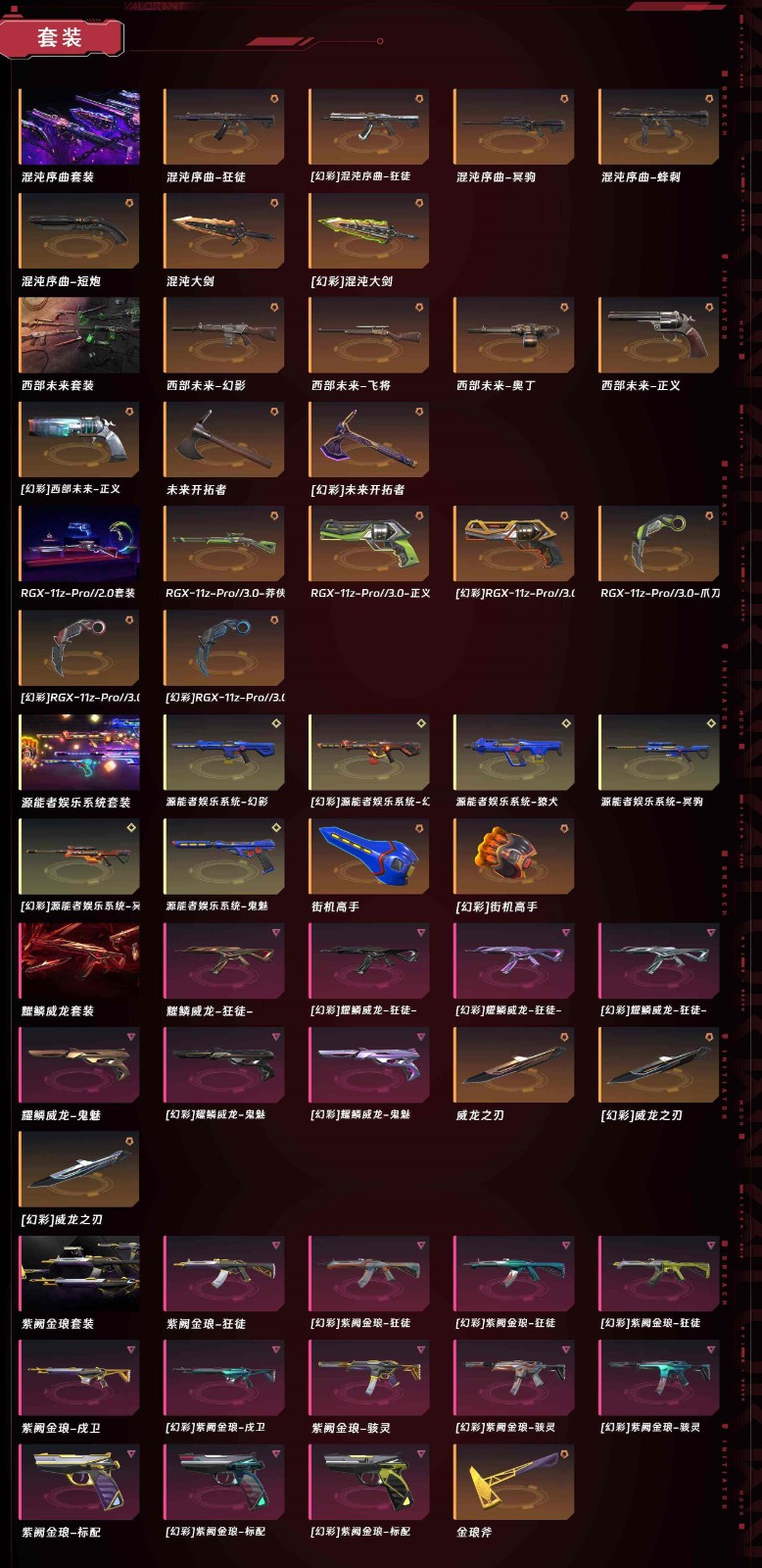 拥有套装】西部未来套装(西部未来-幻影,西部未来-奥丁,西部未来-飞将,西部未来-正义,未来开拓者)混沌序曲套装(混沌序曲-狂徒,混沌序曲-冥驹,混沌序曲-蜂刺,混沌序曲-短炮,混沌大剑)RGX-11z-Pro//3.0套装(RGX-11z-Pro//3.0-莽侠,RGX-11z-Pro//3.0-正义,RGX-11z-Pro//3.0-爪刀)紫阙金琅套装(紫阙金琅-戍卫,紫阙金琅-狂徒,紫阙金琅-骇灵,紫阙金琅-标配,金琅斧)耀鳞威龙套装(耀鳞威龙-狂徒,耀鳞威龙-鬼魅,威龙之刃)