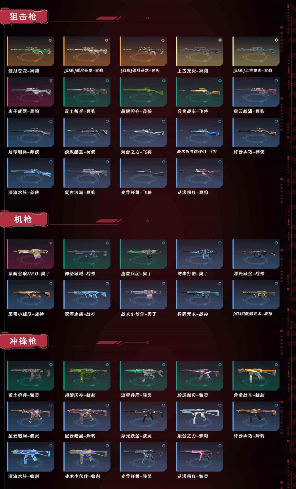 【拥有手枪】天界神兵-鬼魅,海洋之星-短炮,神圣领域-狂怒,荒土机兵-标配,超限闪存-正义,超能偶像-标配,流星兵团-鬼魅,珍珠棘贝-狂怒,钢轨卫士-短炮,钢轨卫士-狂怒,弧光异彩-短炮,合金战车-正义,星云暗涌-鬼魅,月球哨兵-正义,纳米-正义,逆冲蛮牛-狂怒,浮光跃金-标配,模拟赫兹-鬼魅,聚合之力-狂怒,采蜜小蜂队-鬼魅,纤云弄巧-正义,战术熊与伙伴们-狂怒,纤云弄巧-短炮,战术熊与伙伴们-标配,复古浪潮-正义,深海水族-短炮,光导纤维-鬼魅,光导纤维-标配,数码咒术-鬼魅,花漾粉红-狂怒,;西部未来 奥丁,威龙之刃,掠影 狂徒,源能者娱乐系统 幻影,紫阙金琅 狂徒,堕天遗武 狂徒,混沌序曲 狂徒,