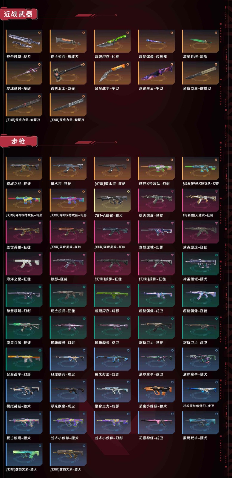 【拥有步枪】双城之战-狂徒,塑水宗-狂徒,砰砰X特攻队-幻影,781-A协议-獠犬,堕天遗武-狂徒,盖世英雄-狂徒,赛博迷城-幻影,冰点凝冻-狂徒,海洋之星-狂徒,掠影-狂徒,神圣领域-獠犬,神圣领域-幻影,荒土机兵-狂徒,超限闪存-幻影,超能偶像-戍卫,超能偶像-狂徒,流星兵团-狂徒,珍珠棘贝-幻影,珍珠棘贝-戍卫,钢轨卫士-狂徒,钢轨卫士-戍卫,合金战车-幻影,月球哨兵-戍卫,纳米-幻影,逆冲蛮牛-戍卫,逆冲蛮牛-獠犬,模拟赫兹-獠犬,浮光跃金-戍卫,聚合之力-幻影,采蜜小蜂队-獠犬,战术熊与伙伴们-戍卫,复古浪潮-獠犬,战术小伙伴-獠犬,战术小伙伴-幻影,花漾粉红-戍卫,数码咒术-獠犬,