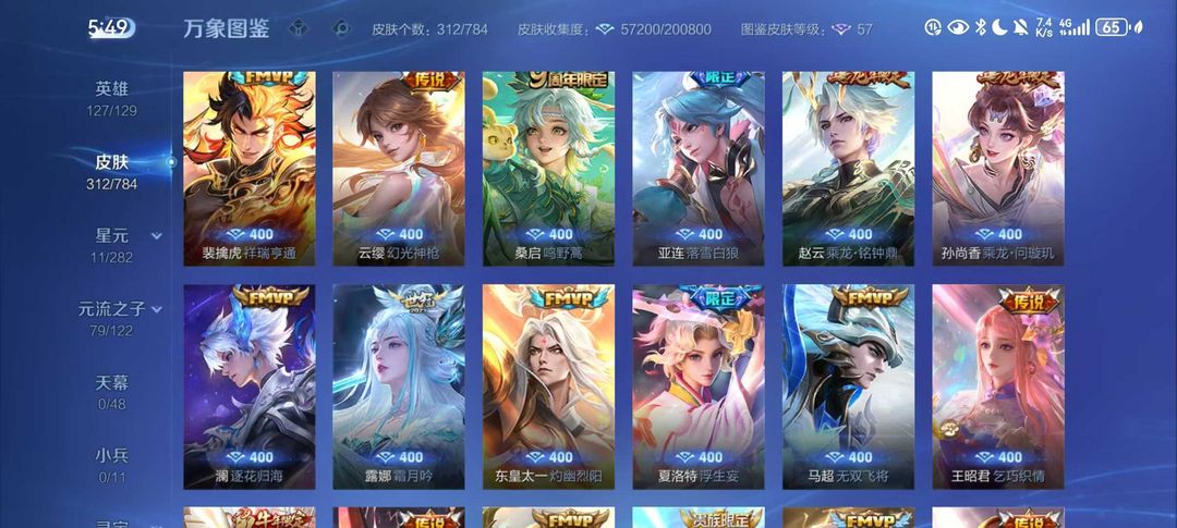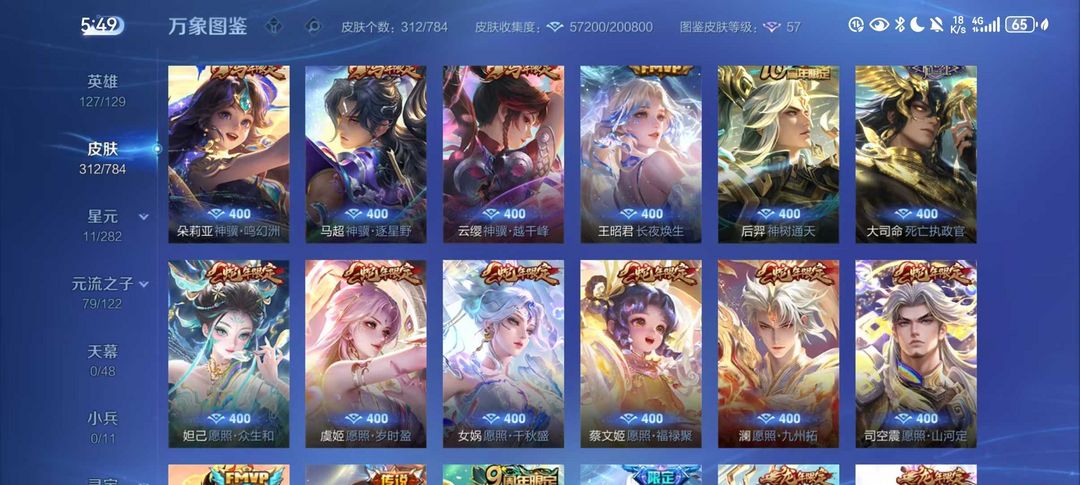 扫码登录。VIP10。385皮肤,七水,四星元,双王者之证!武则天神域,李白荣耀典藏,全息碎影,全符文,各种限定,各种机甲,皮肤都有,绝对满足各位